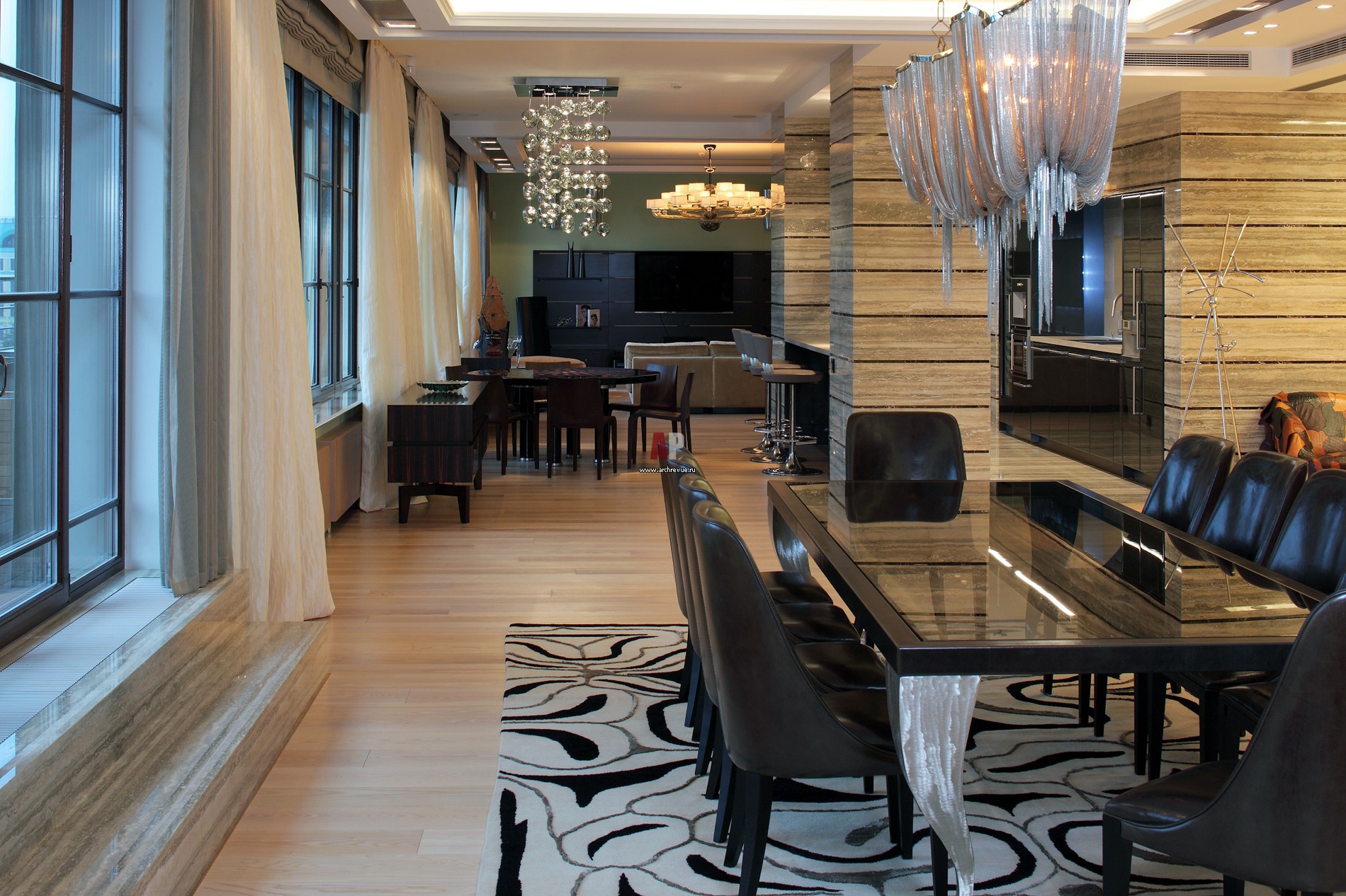 Гостиная состоит из трех функциональных зон: столовой с камином, кухни со столом для завтраков и мягкой группы с ТВ. Все они вытянуты вдоль панорамных окон с видом на Москва-реку.