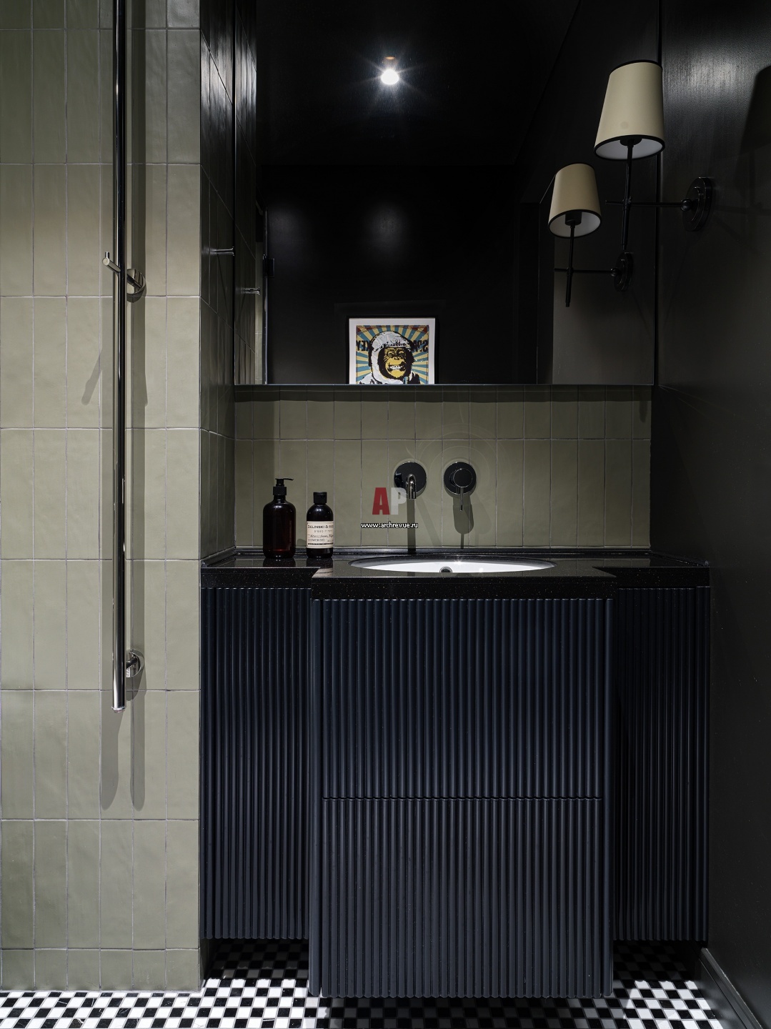 Мужской санузел оформлен в графичной черной палитре. Умывальник изготовлен на заказ.