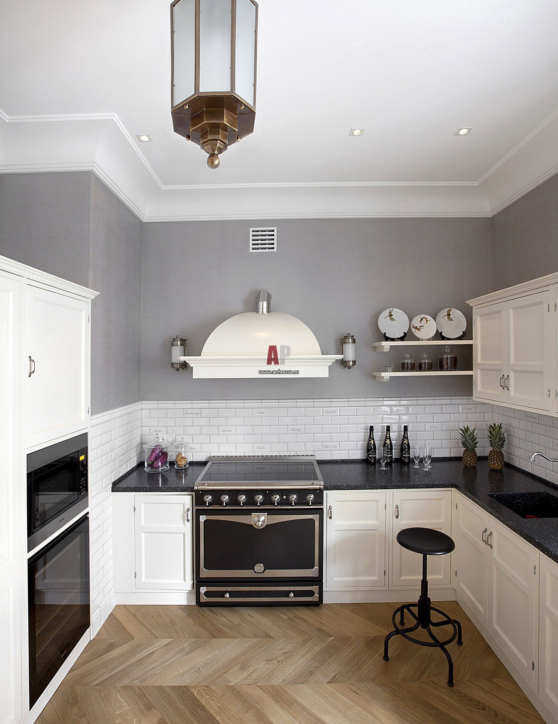 Интерьер кухни в стиле ар-деко. Паркет из клена уложен елочкой. На фартуке – керамическая плитка Metro.
