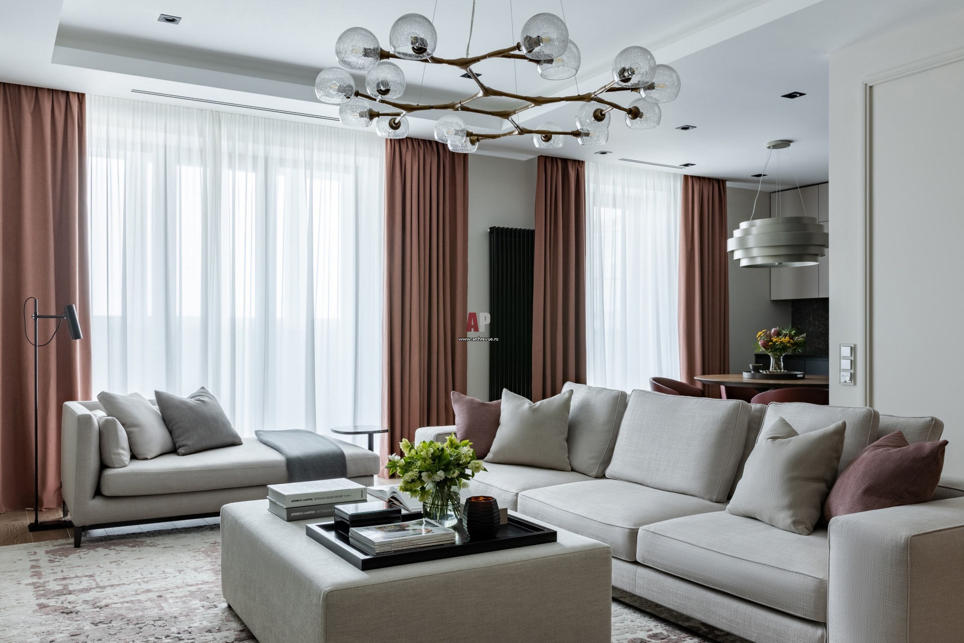 Стены гостиной выкрашены в базовый серый оттенок. Диван, кушетка, кресло, Minotti. Потолочный светильник, Arteriors. Торшер, Rubn.
