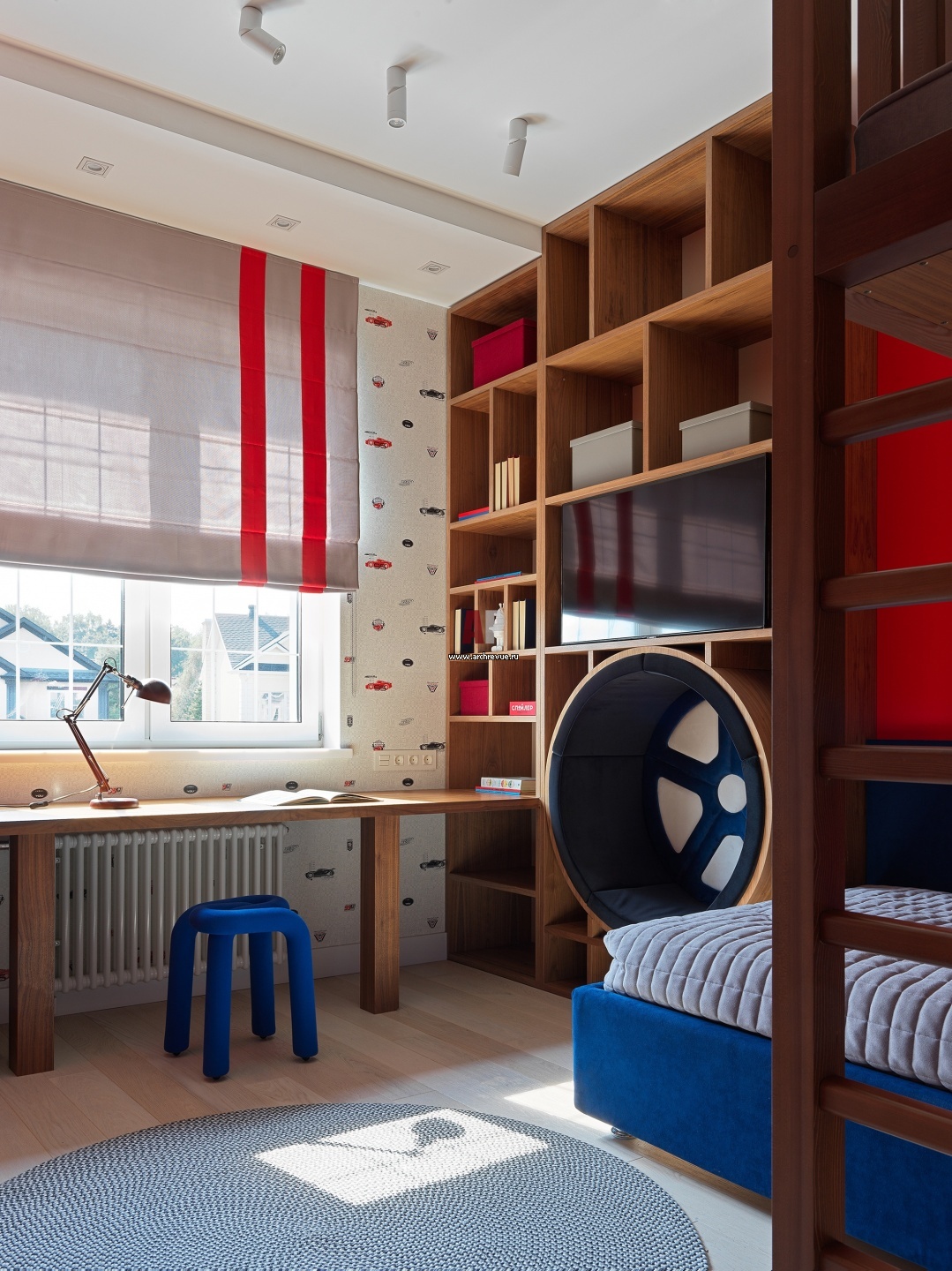 Спальня мальчика. Детские изначально были с готовыми кроватями, к ним дизайнер додумала уже весь декор, свет и мебель.