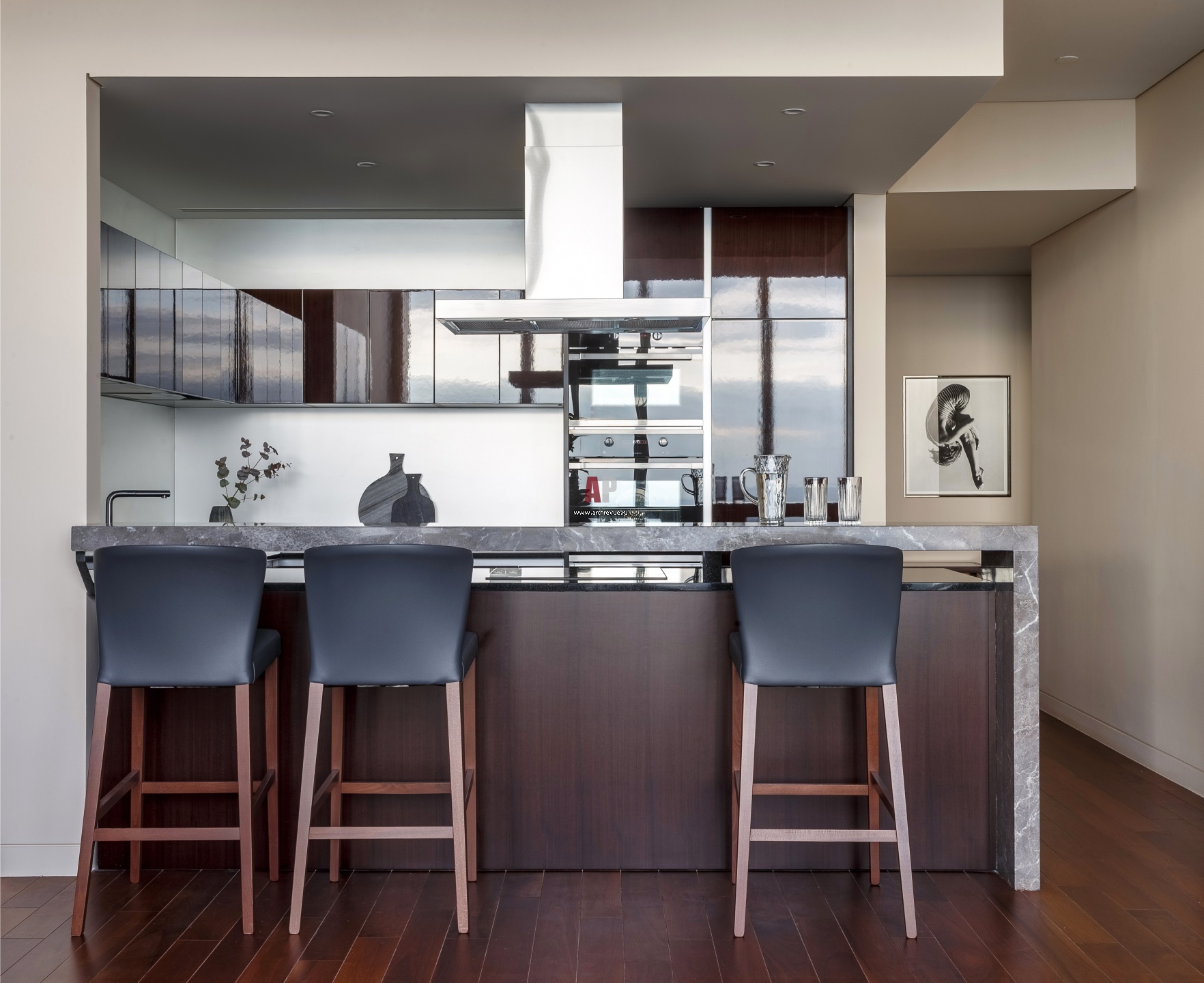 Небольшая кухня включена в пространство гостиной. Фасады немецкого кухонного гарнитура выполнены из красного дерева под лаком. Барные стулья, Crate and Barrel.