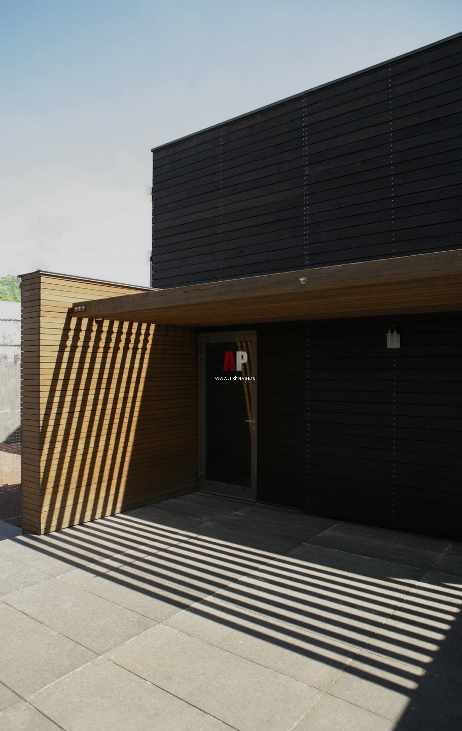 Снаружи дом частично обшит черными досками. Навесы из деревянных реек отбрасывают на землю красивые тени.
