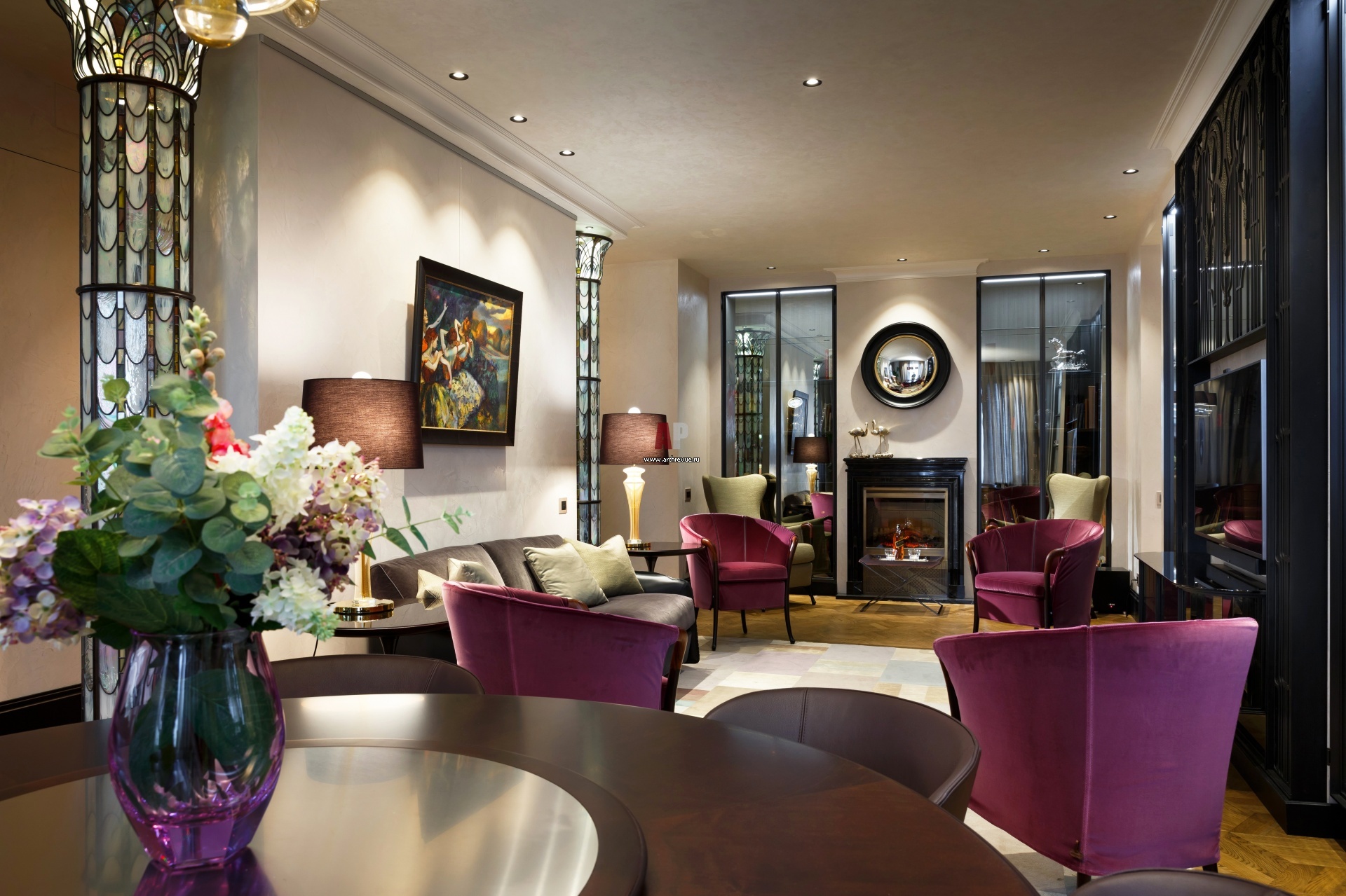 Интерьер гостиной с элементами стиля ар-деко и сложной жемчужной цветовой гаммой с аметистовыми акцентами. Фрагменты несущих конструкций обыграны как витражные колонны и пилястры. Диван, кресла, Giorgetti. Люстра, настольные лампы, Barovier & Toso.