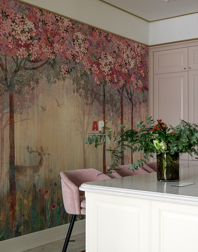 Кухня. Остров с барными стульями. Стена декорирована фреской.