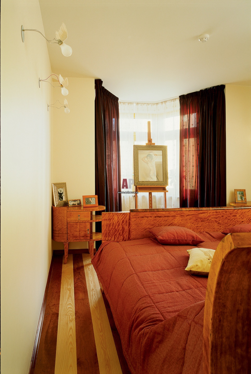 Спальня с эркером на втором этаже. Кровать обращена изголовьем ко входу, а изножьем – к окну. Такую планировку подчеркивает пол, выложенный массивной доской двух контрастных цветов. Текстиль терракотового цвета.