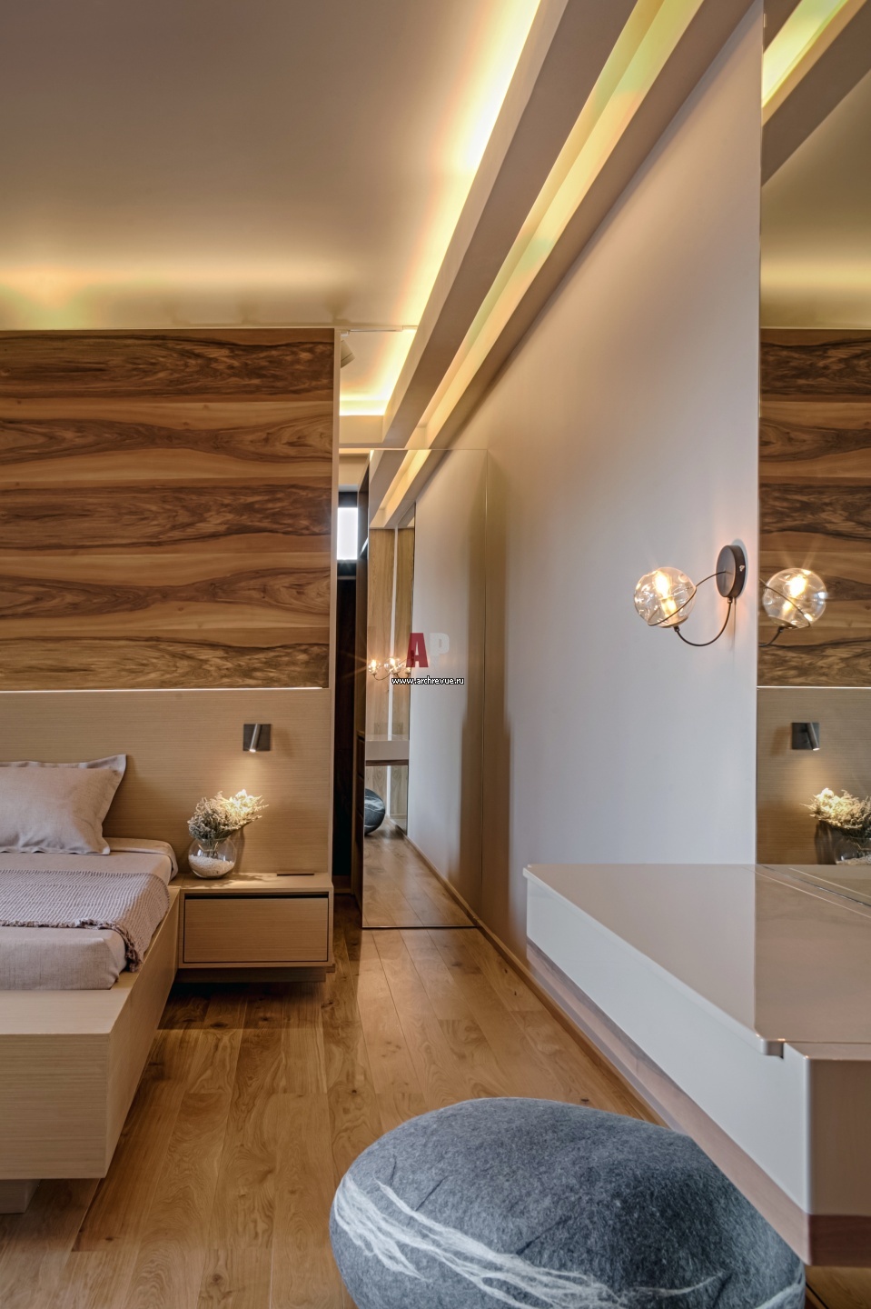 Главная спальня. За изголовьем кровати находятся две отдельные гардеробные — мужская и женская. Для спальни разработали кровать с декоративным изголовьем во всю высоту комнаты, обитым шпоном ореха. Мягкий пуф, Dolly Stone. Прикроватные бра, Astro.