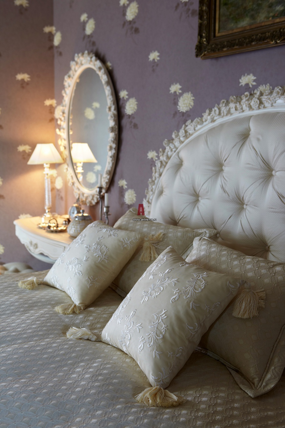 Английский стиль в оформлении спальни дочери. Молочно-белые подушки украшены вышивкой. Над консолью – зеркало в овальной белой раме.