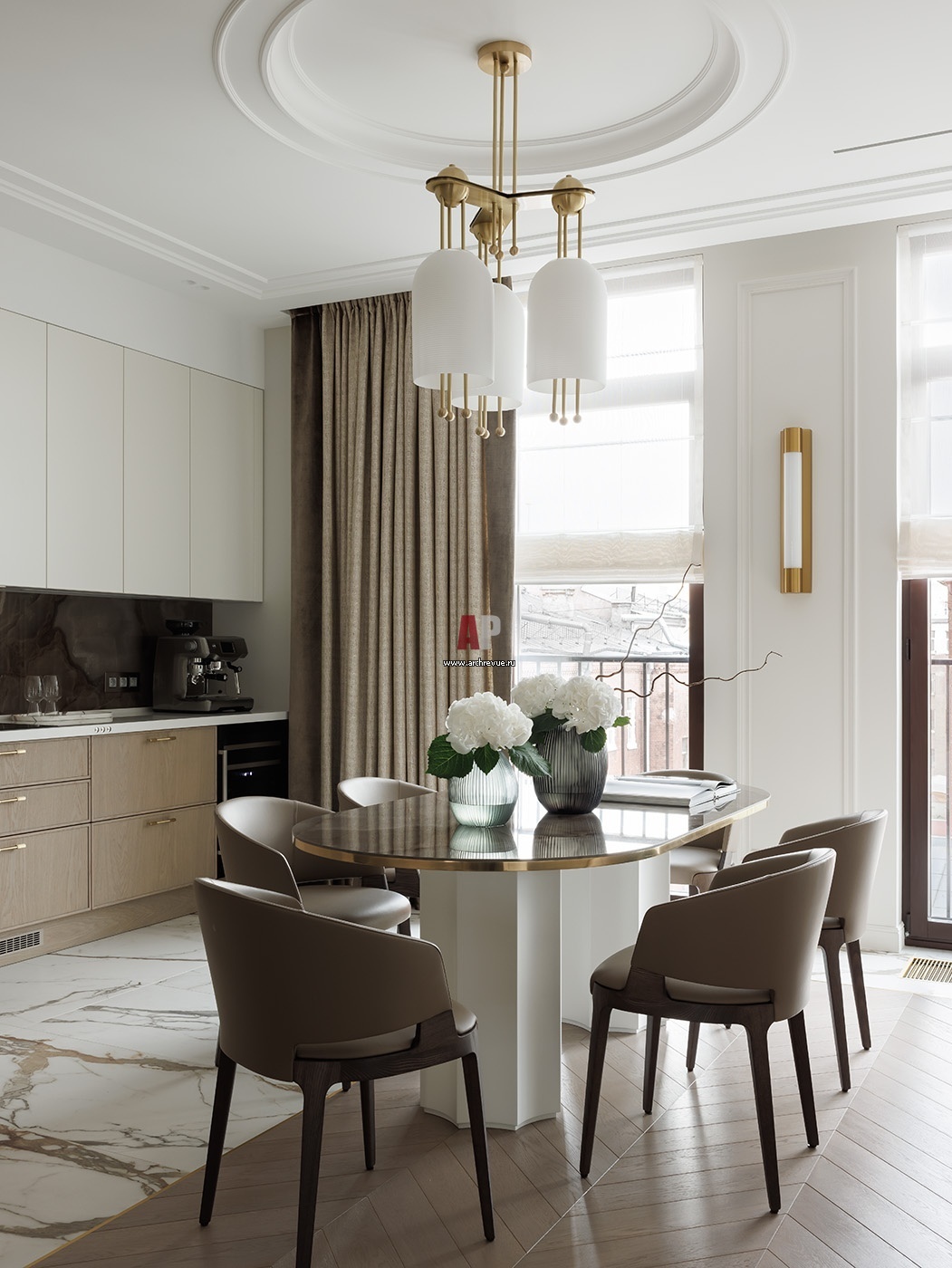 Зона столовой в общей гостиной выделена потолочной розеткой крупного масштаба с неоклассической люстрой. Обеденный стол, Carin Casa. Стулья, Potocco. Фартук оснащен механизмом, который открывается. В нише установлены полки для хранения специй и другой мелкой утвари.