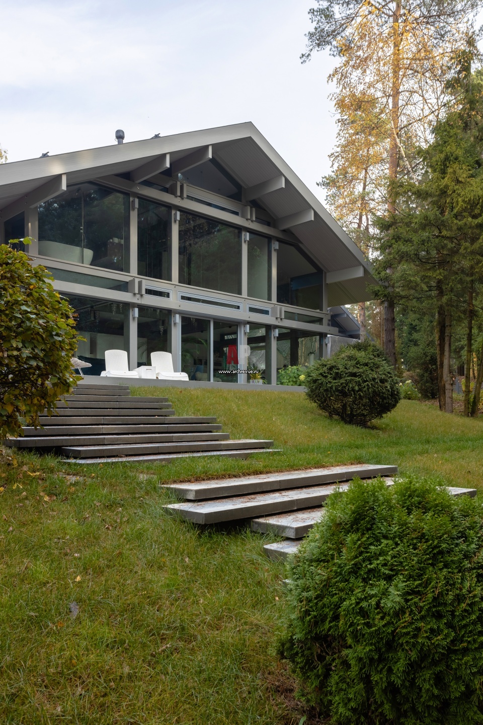 Каркасный дом с панорамным остеклением. Каркас выполнен из клееного бруса, стены теплого контура – панели Green Board, энергоэффективные стеклопакеты с низкоэмиссионным стеклом, Schuco.