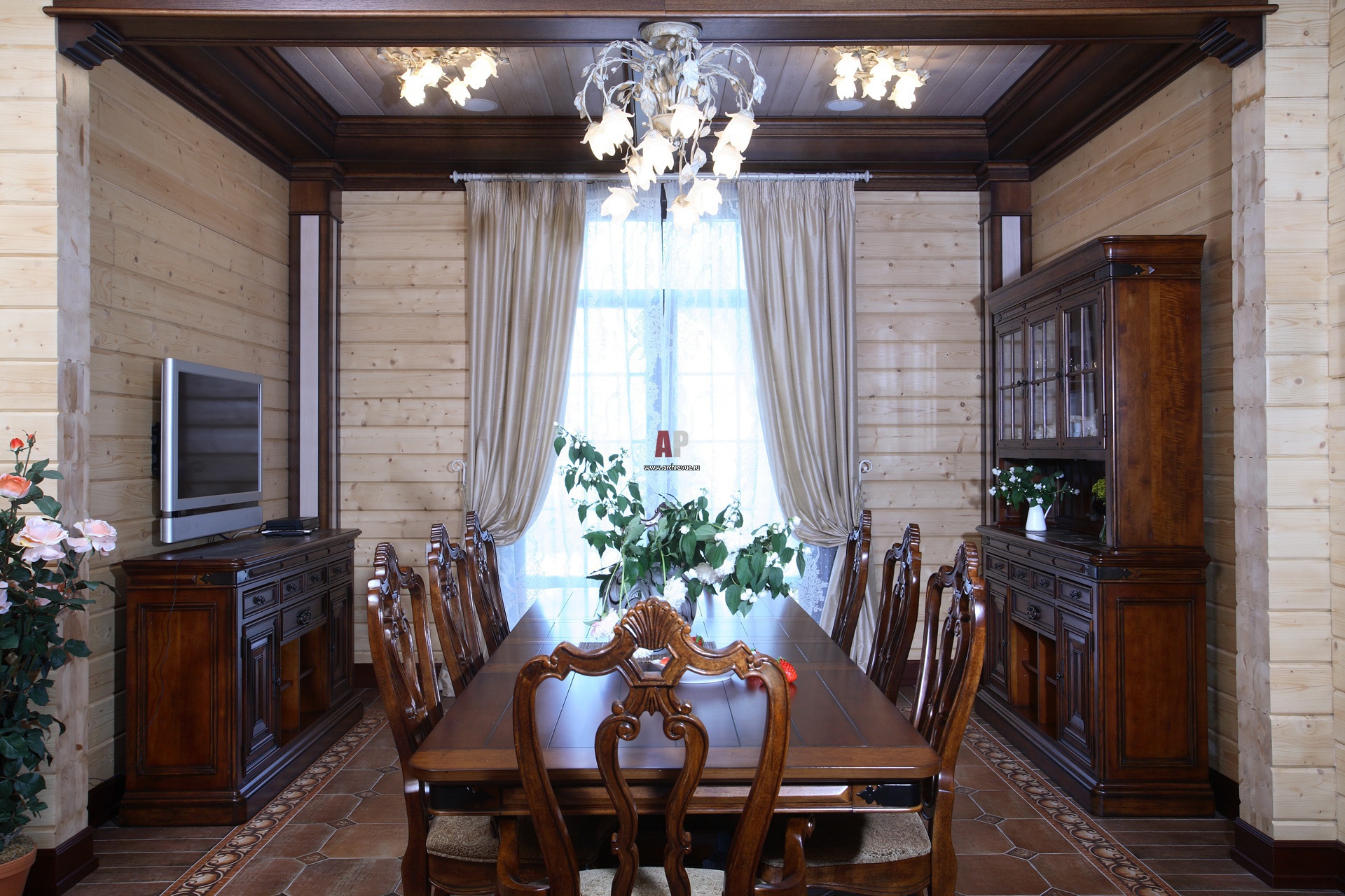 Столовая группа. Стены из соснового бруса оставлены открытыми. Брус отделан бесцветным защитным составом.