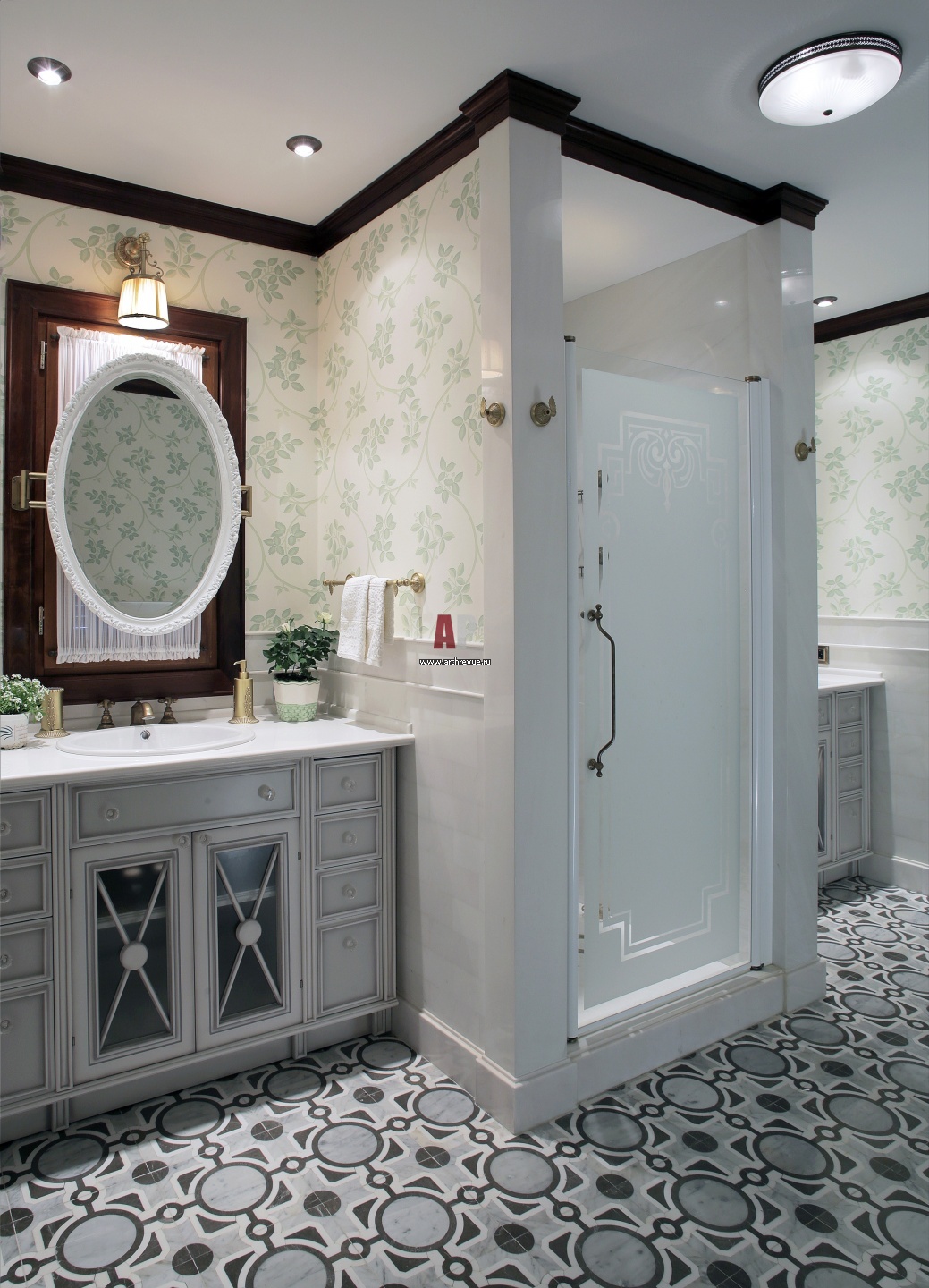 Хозяйская ванная комната. На полу – наборная каменная мозаика.