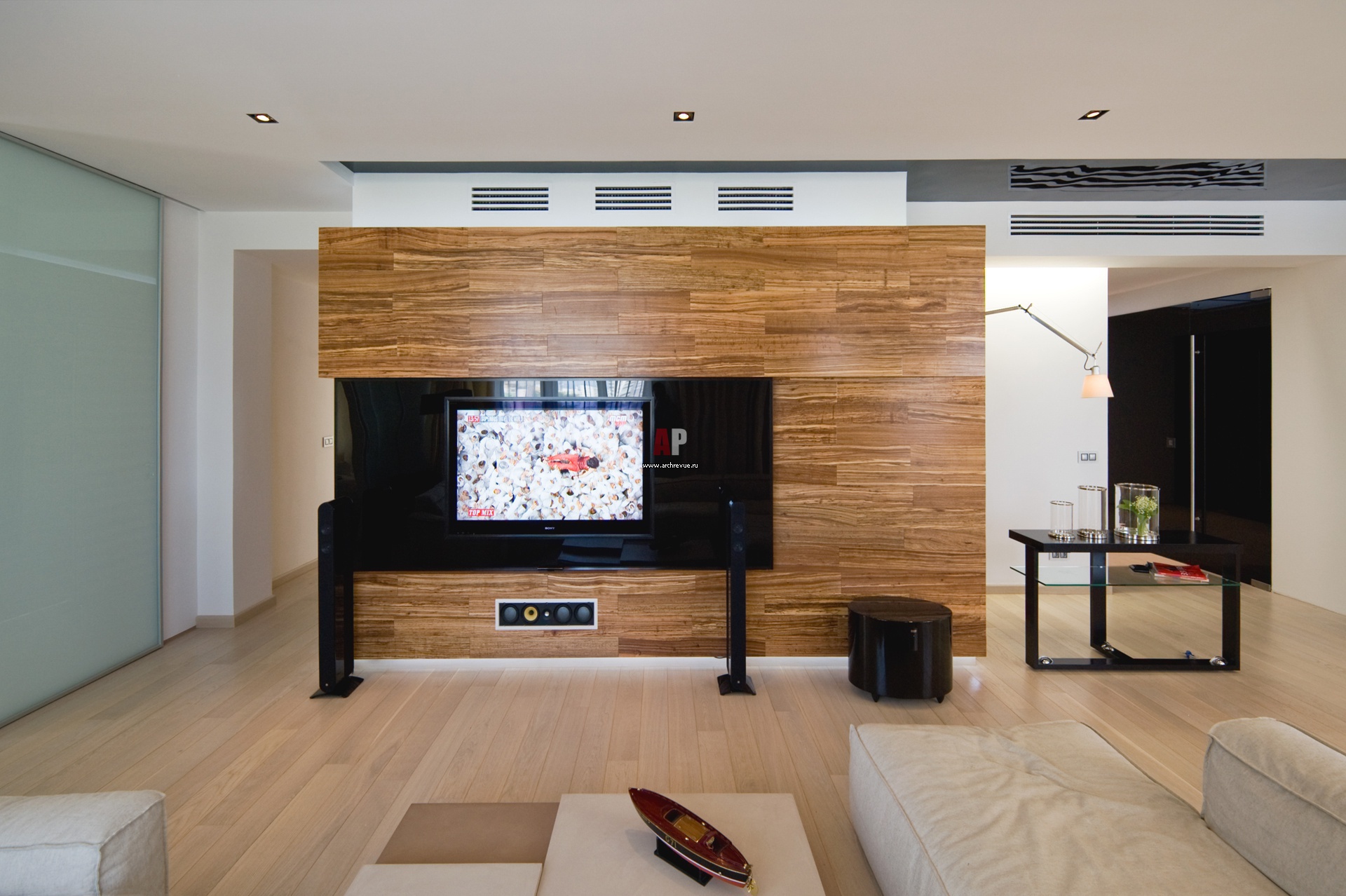 Интерьер диванной группы с ТВ в общей гостиной. Стойка ТВ зашита паркетной доской. Открытое пространство зонировано перегородками из матового стекла. Рельсы для них встроены в подвесной потолок.