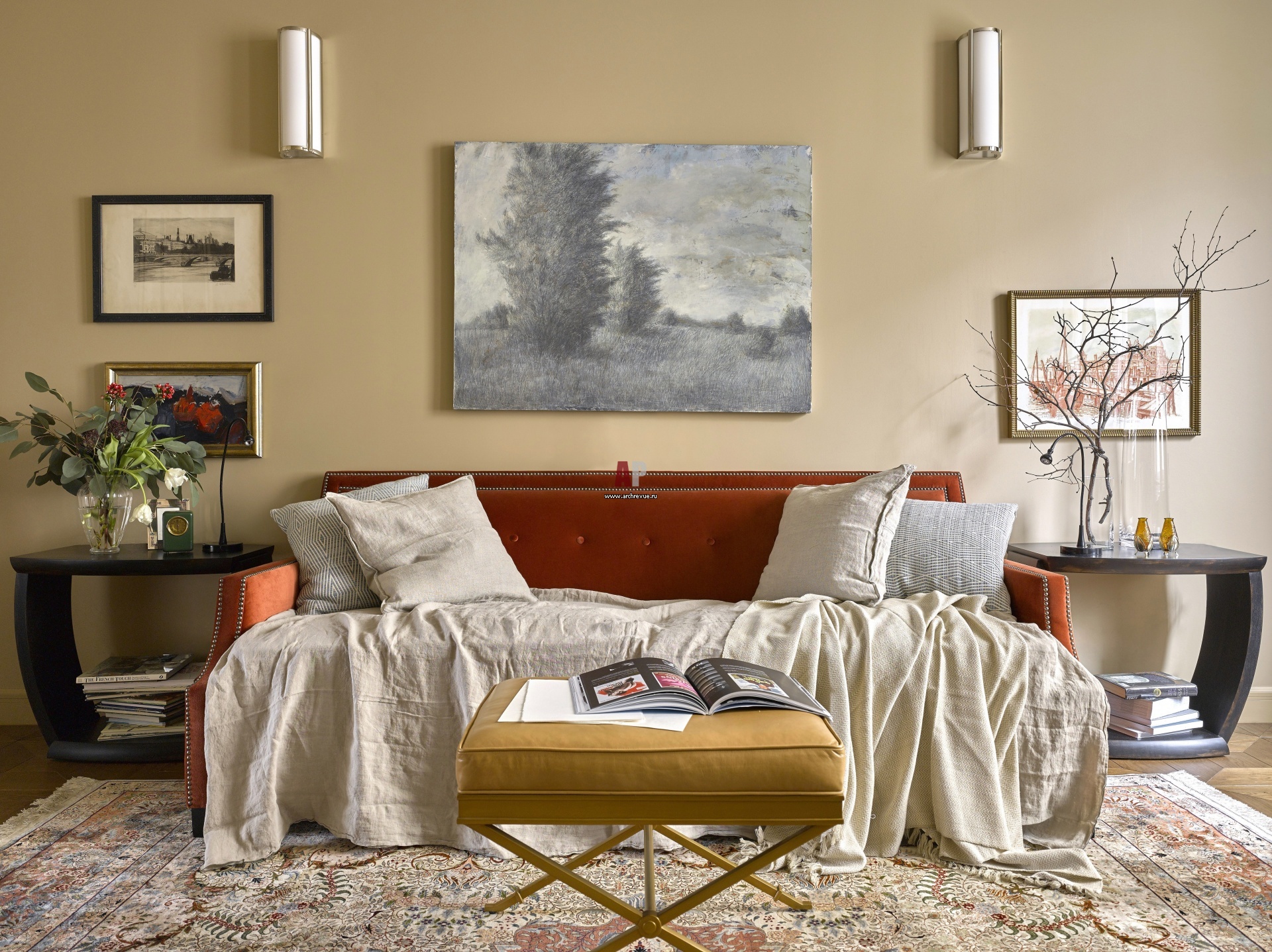 Интерьер гостиной в американском стиле. Стены выкрашены в цвет загара. Оранжевый диван, кресла, Bernhardt. Банкетка, Hickory Chair. Столики, Century Furniture.