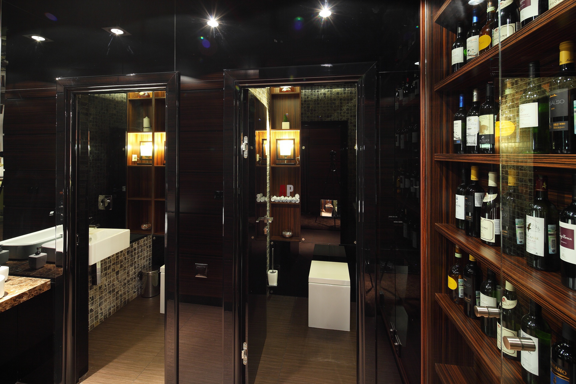 Санузлы находятся рядом с винным шкафом и оформлен черными глянцевыми панелями. Решенные в одной цветовой гамме: бар, туалетные комнаты, винный шкаф зрительно составляют единое целое.