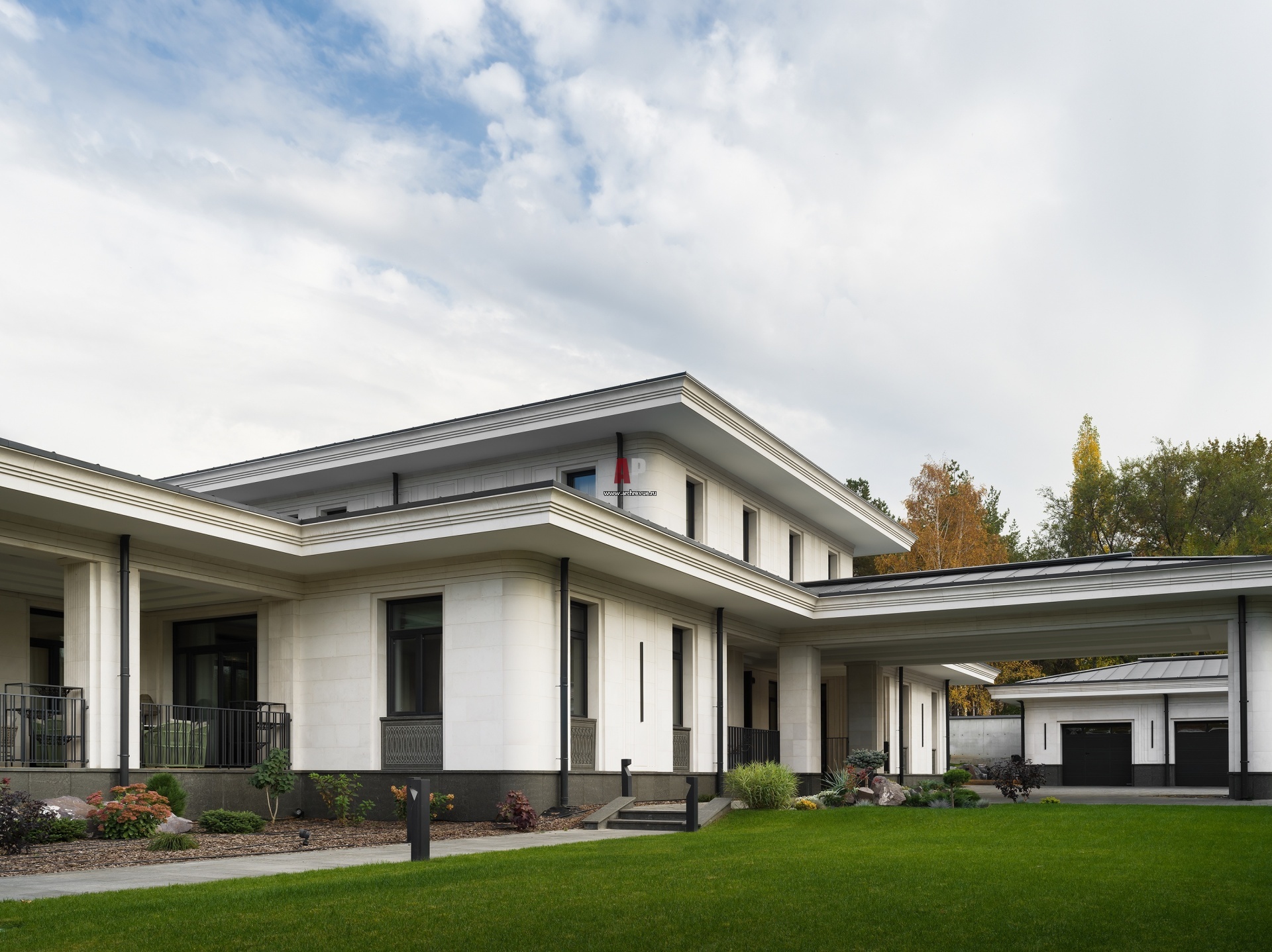 Двухэтажная резиденция – стильный архитектурный ансамбль, идеально интегрированный в ландшафт. Дом имеет вытянутые горизонтальные формы и кажется «распластанным» по земле, подчеркивая естественность и органичность окружающей природы.
