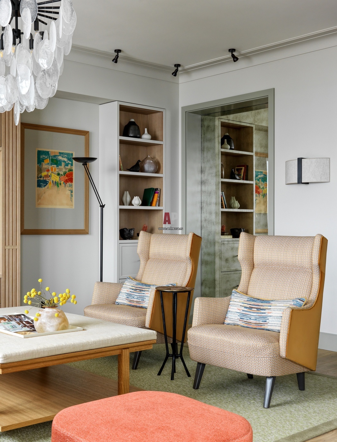 Гостиная. Настенный и напольный светильники, Stephane Davidts. Кресла, Arteriors в обивке тканью Robert Allen. Журнальный столик со съемной мягкой столешницей, на заказ. Банкетка, Marie's Corner в обивке тканью Pierre Frey. Приставной столик, Currey & Company. В нише – состаренное зеркало.