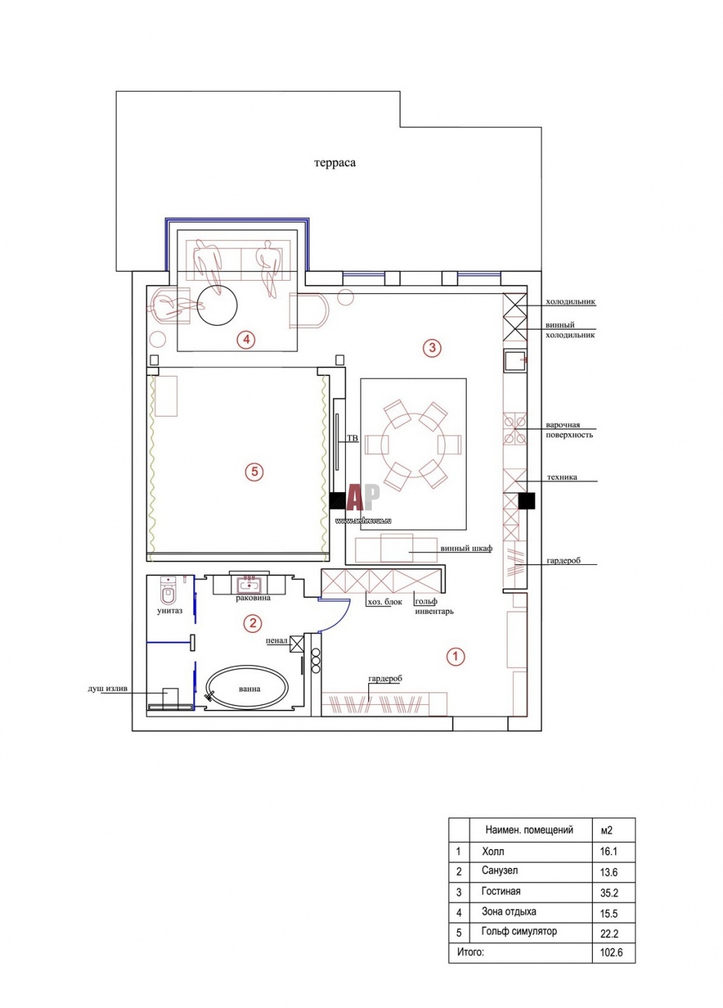 Планировка студийной квартиры для игры в гольф и отдыха.