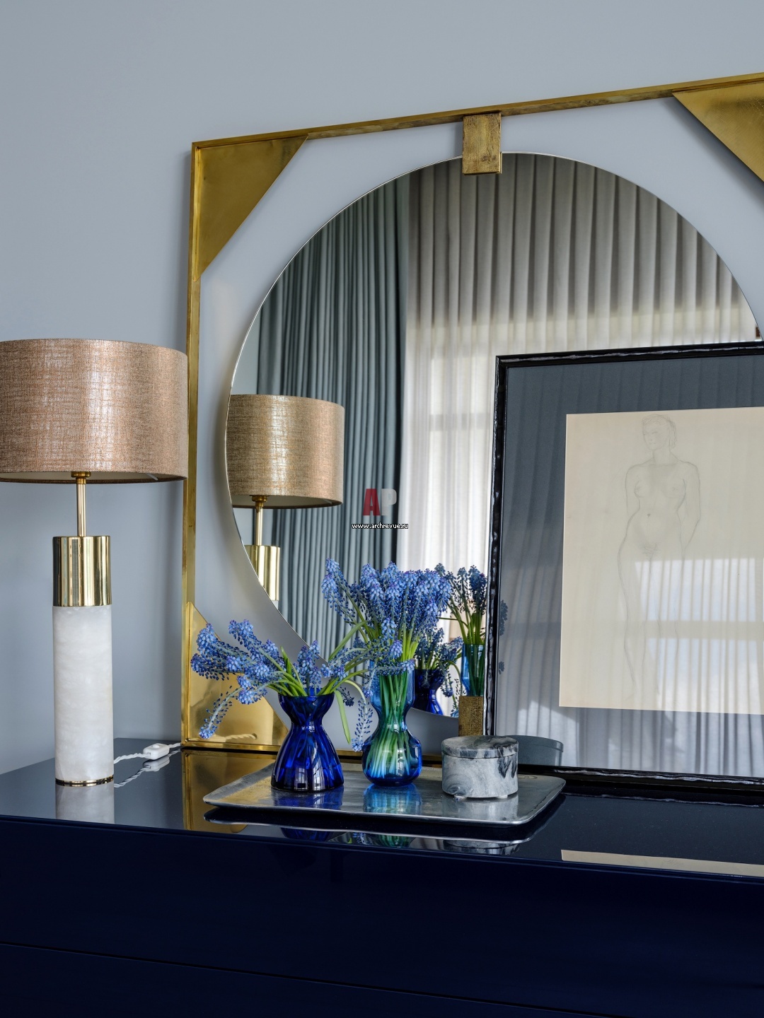 Интерьер спальни. Комод из темного дерева, Lema. Зеркало в латунной раме изготовлено на заказ, по эскизам автора проекта.