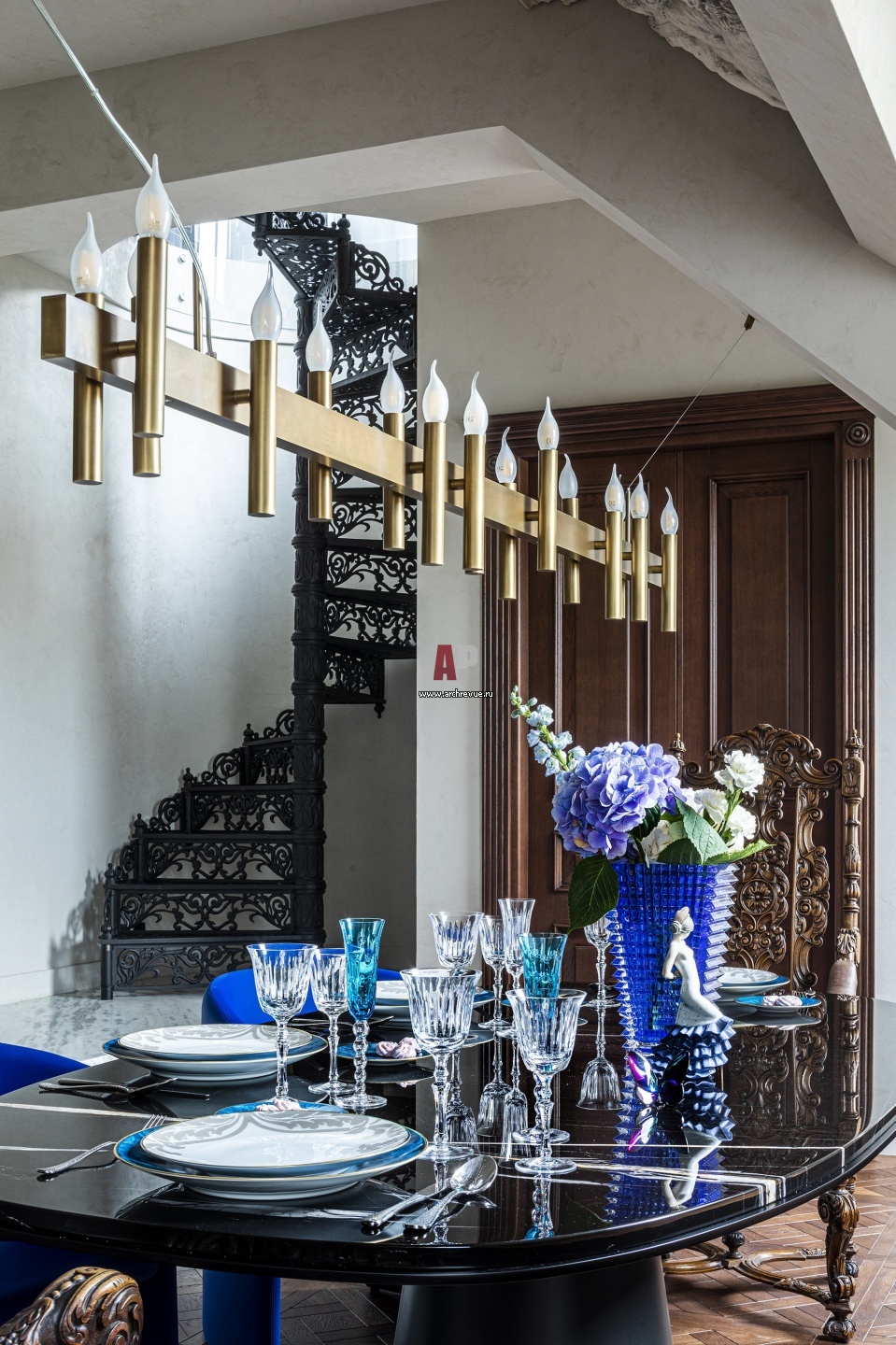 Мансардная квартира с антиквариатом. Интерьер столовой. Чугунная винтовая лестница ведет в гостиную на втором этаже.