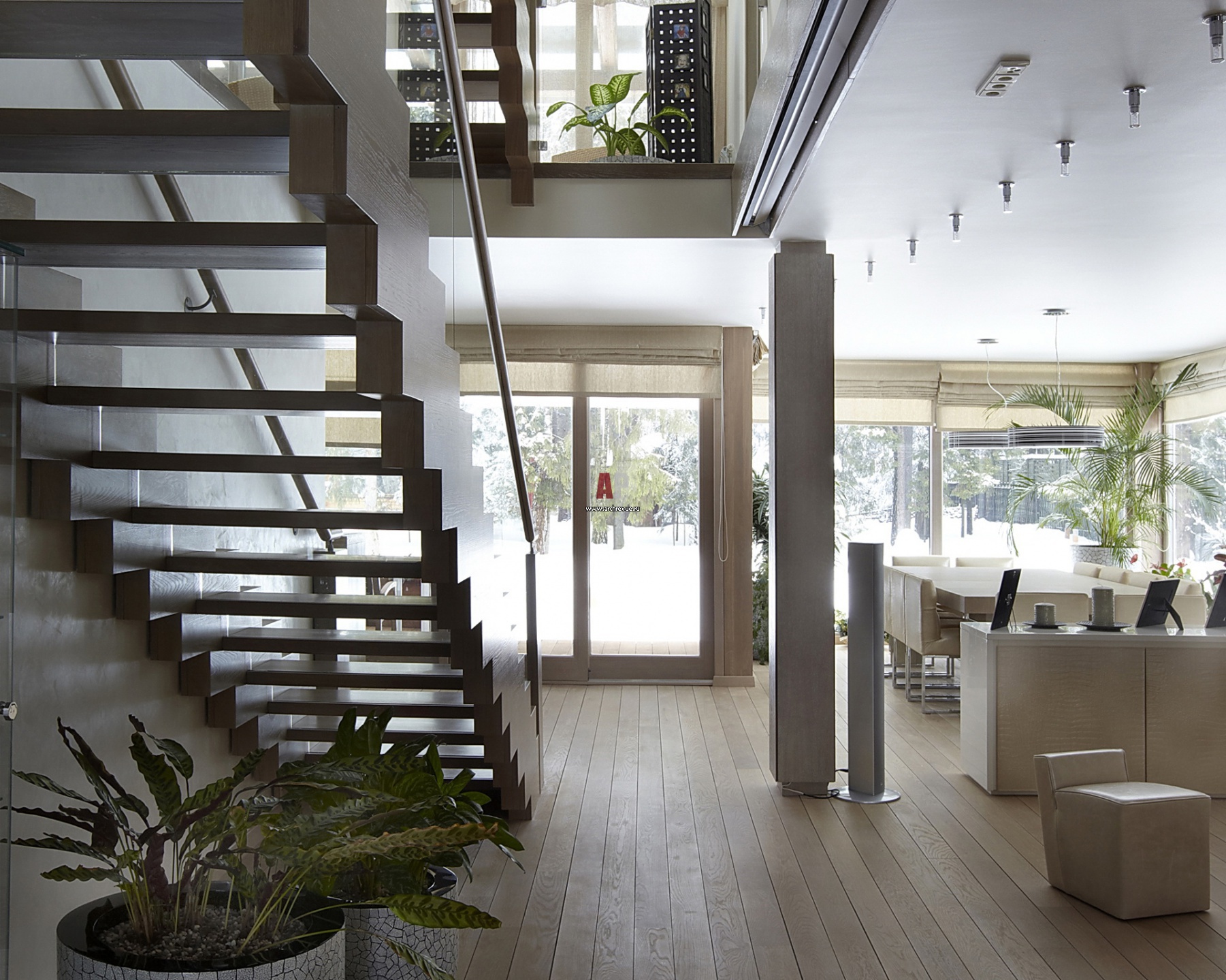 Гостиная, столовая и лестничный холл решены в едином пространстве. Ограждение лестницы, двери, несущие колонны, оконные рамы, массивная половая доска, мебель выполнены из беленого дуба.