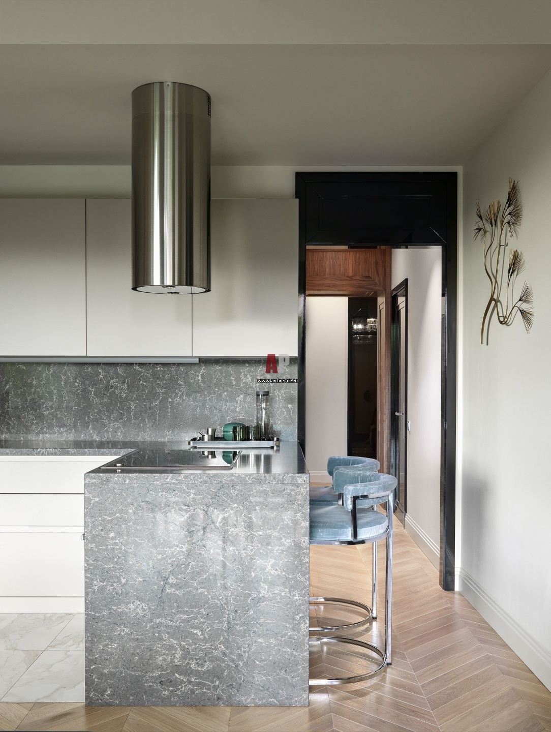 Нейтральная минималистская кухня растворяется в интерьере общей гостиной. Барные стулья, на заказ. Столешница кварц, Caesarstone Coastal Grey. Настенная скульптура из латуни, C. Jere – C. Jere.