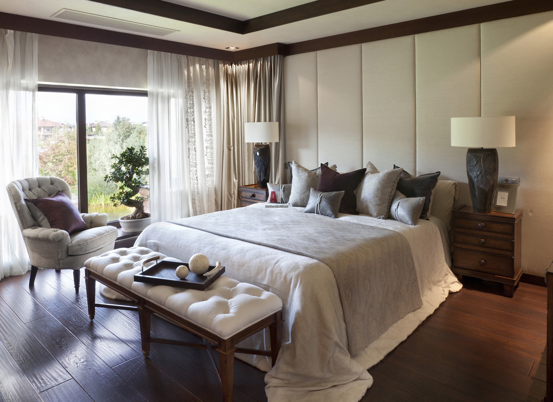 Спальня с панорамными окнами. Стены зашиты панелями из ткани цвета слоновой кости.
