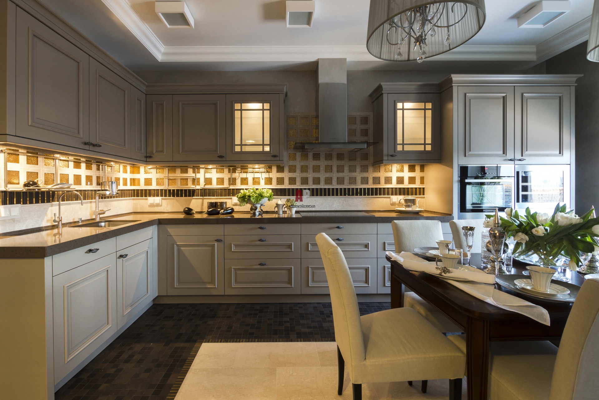 Интерьер кухни в стиле неоклассика. Кухонный гарнитур, Eggersmann, модель Palermo. Стол Selva, модель Melodia. Стулья, Meridiani, модель Tailor Uno. Люстра Savoy от Eichholtz. Фартук выложен плиткой CottoVeneto (серия Gold collection). Стены, декоративная штукатурка Diora, поставщик «Стенология».