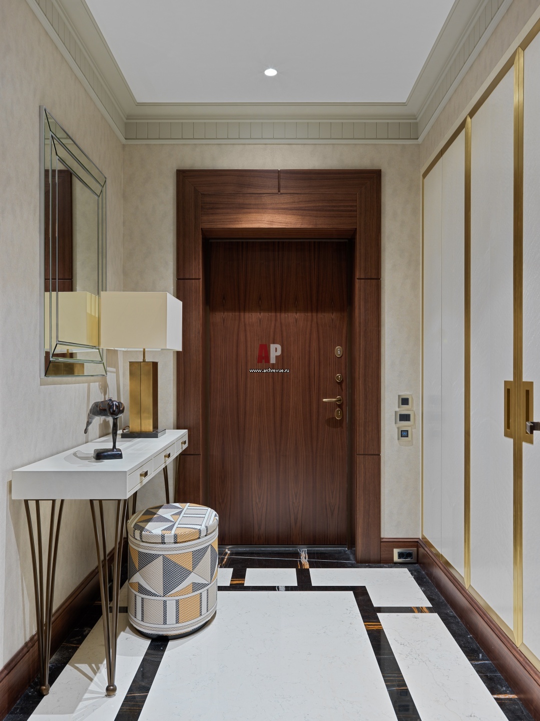 Прихожая. Пол облицован контрастным мрамором с геометрической раскладкой. Консоль, Julian Chichester. На ней – скульптура Михаила Дронова «Конькобежец».