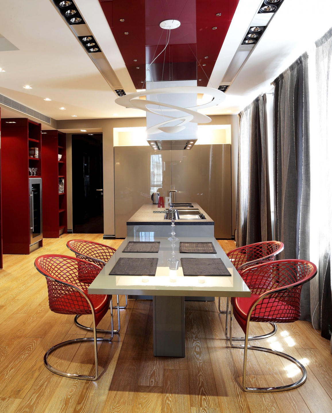 Фото интерьер кухни-столовой в современном стиле. Красный глянцевый натяжной потолок выделяет обеденную группу. Стулья, Matteograssi.