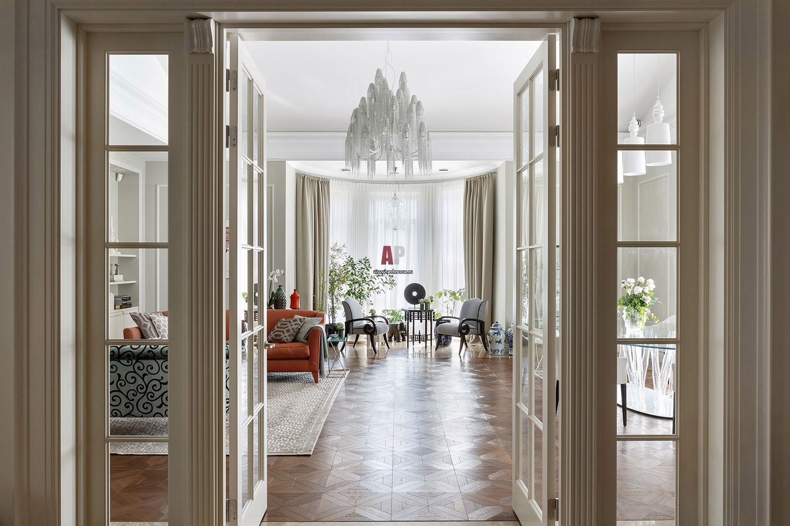 Интерьера загородного дома с элементами современной легкой классики и скандинавского дизайна.