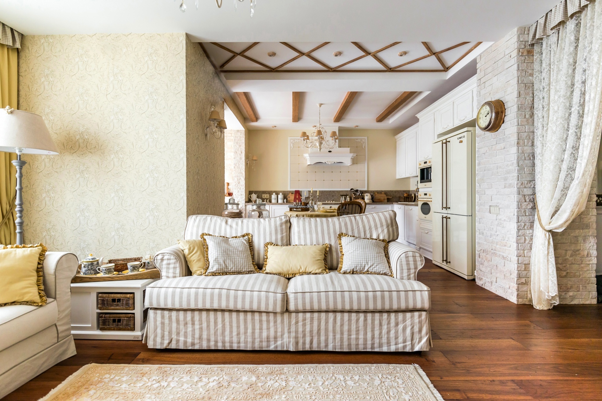 Интерьер гостиной с элементами французской классики, стиля шале и Прованс.