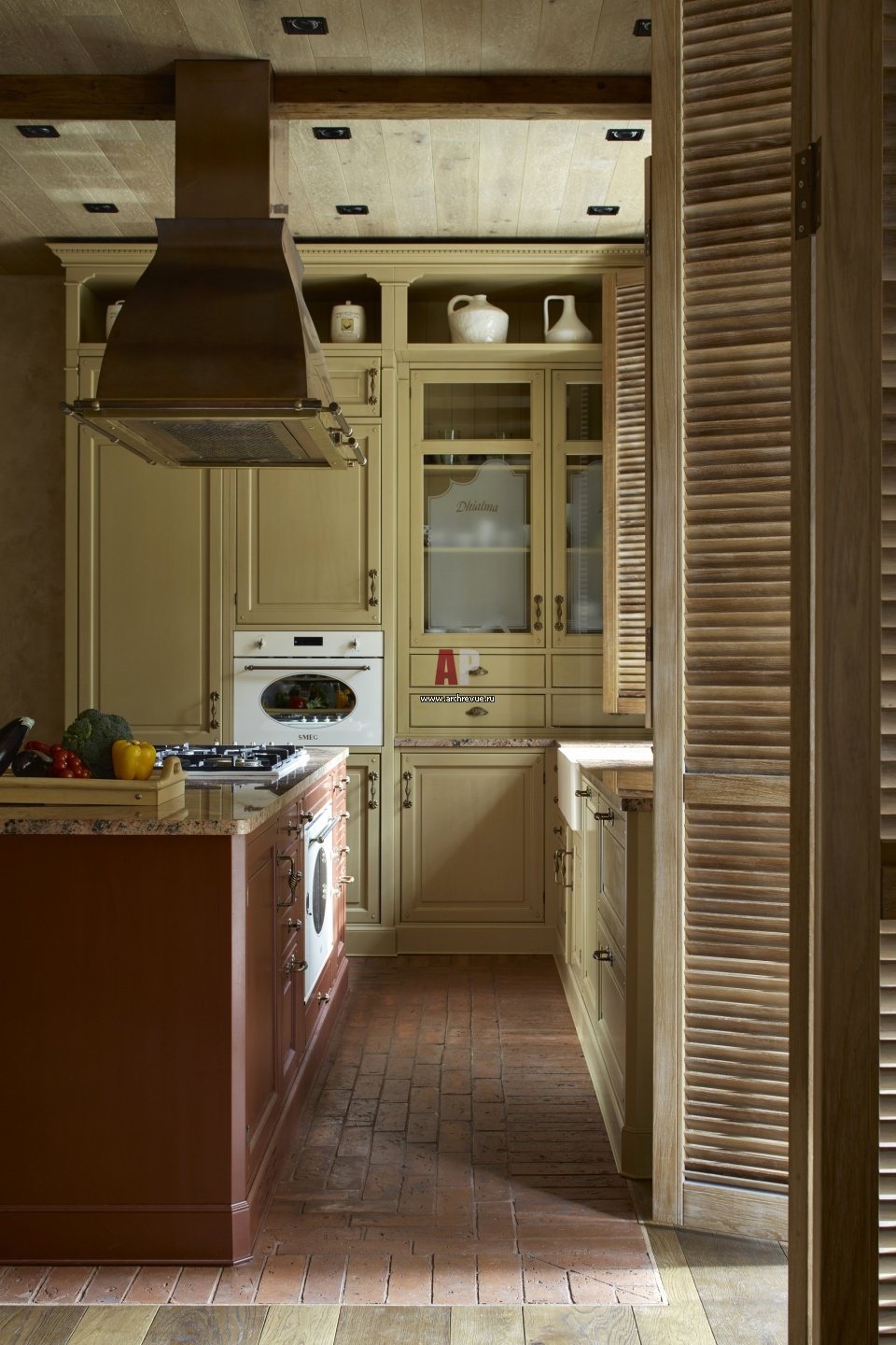 Кухня оснащена бытовой техникой Smeg в винтажном стиле. Медная вытяжка изготовлена на заказ.