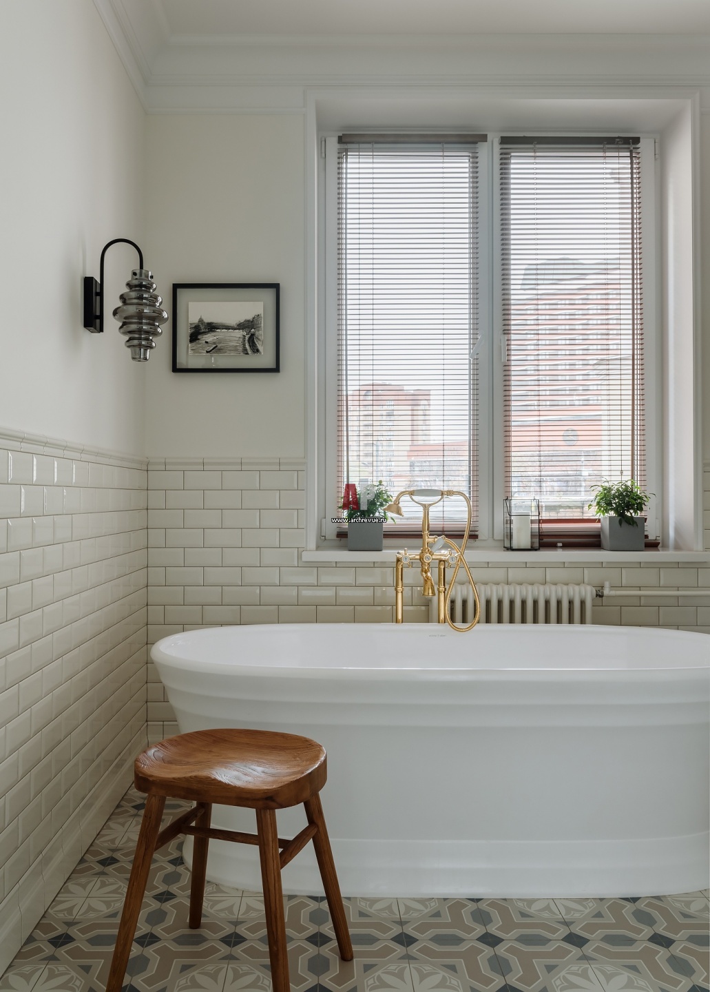 Окно в санузле было изначально, оно значится в планах БТИ. Напольная плитка, Vives. Отдельно стоящая ванна, Victoria + Albert.