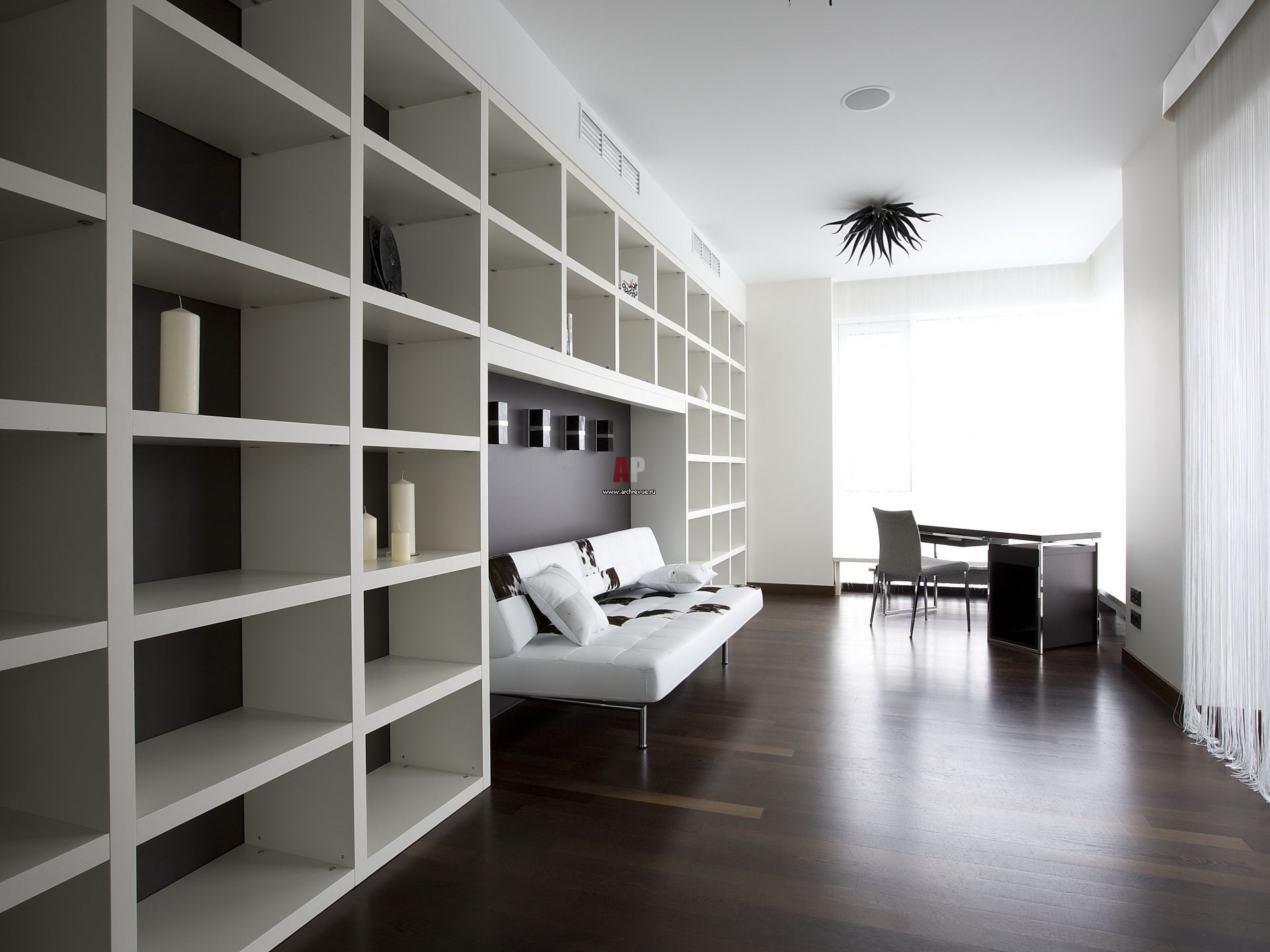 Кабинет выполнен в контрастной цветовой гамме. На полах – массивная доска венге. Письменный стол придвинут к панорамному окну. Мягкая зона обрамлена стеллажами.