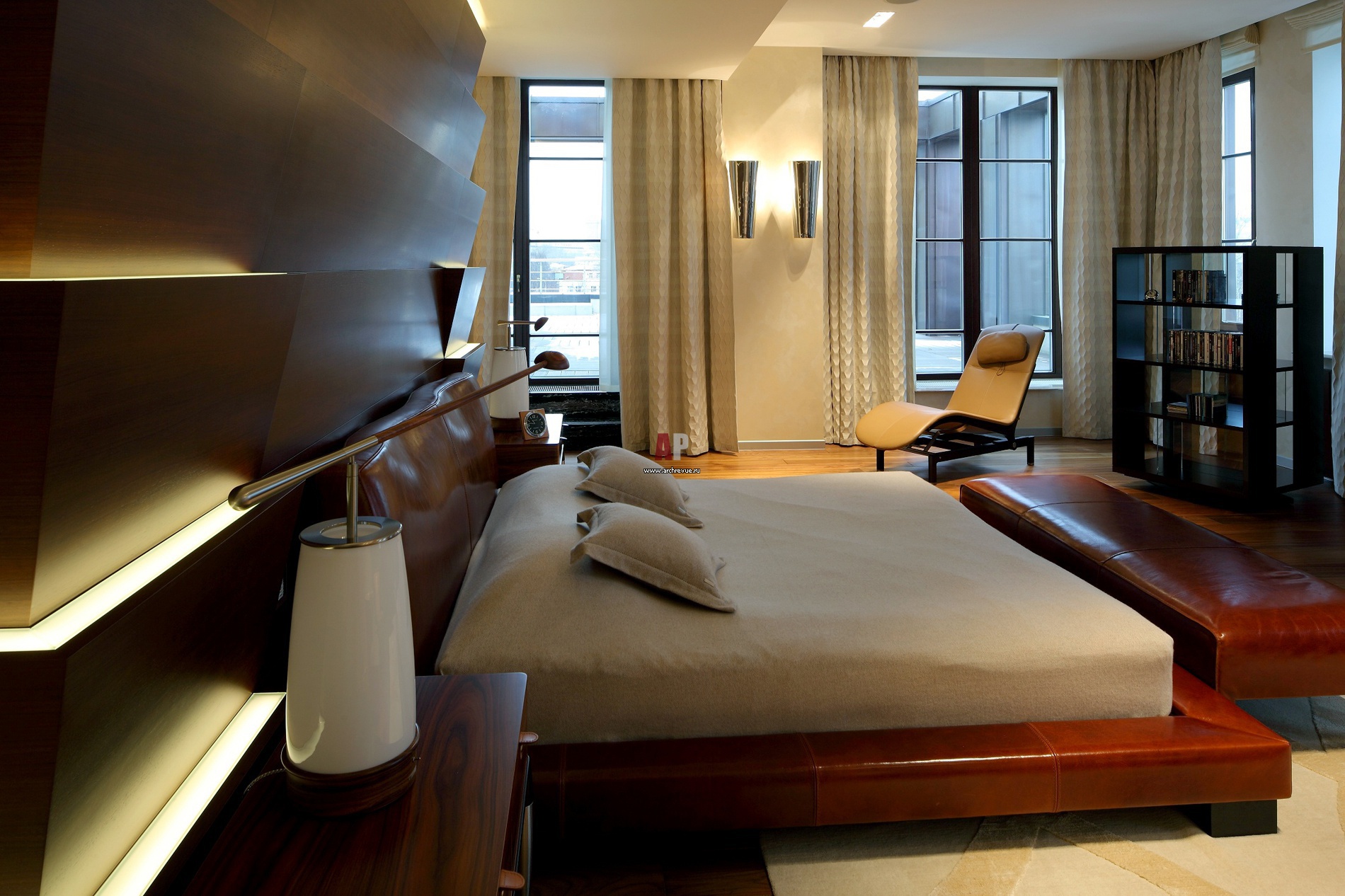 Фото хозяйской спальни. Кровать, кресла, Baxter. Шезлонг, Giorgetti. Шторы с инновационной «чешуйчатой» поверхностью, Dedar.