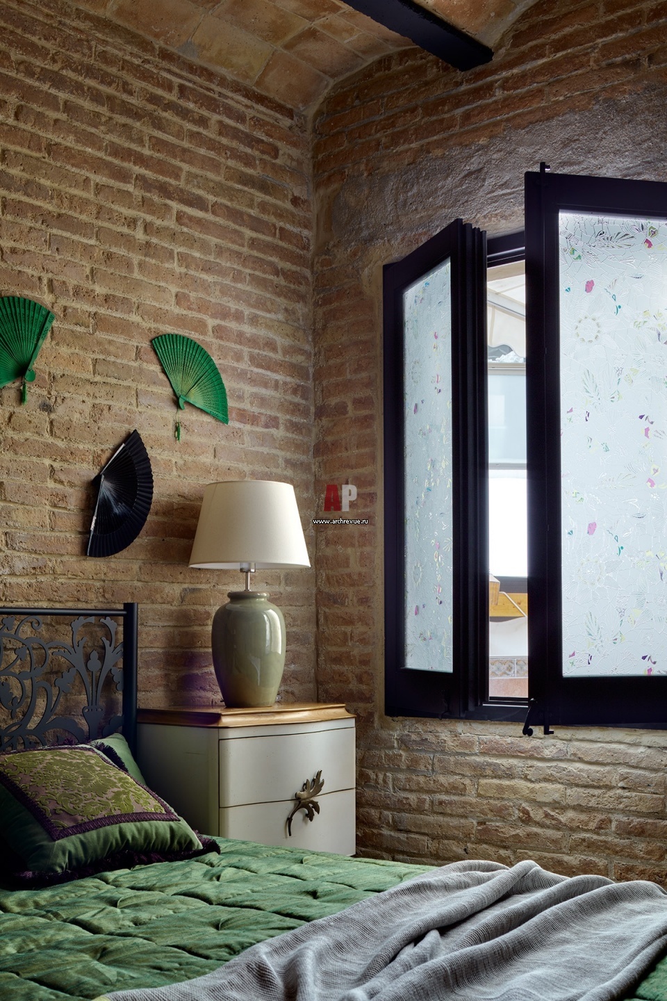 Квартира в Барселоне. Интерьер спальни. Витражные окна добавляют в помещения света и в то же время позволяют избежать открытых солнечных лучей.