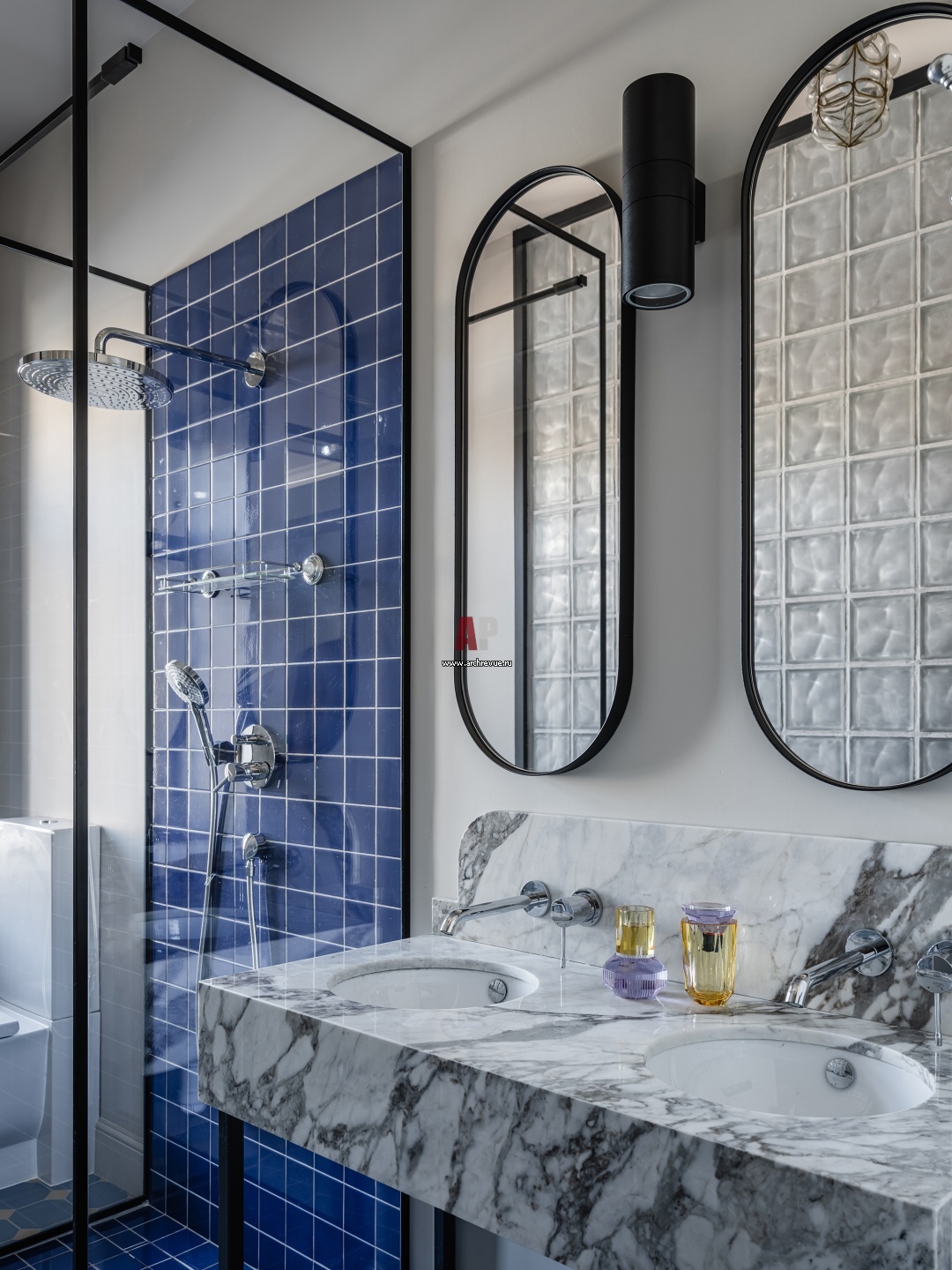 Детский санузел на первом этаже. Душевая оформлена синей плиткой, столешница с двумя раковинами выполнена из мрамора.