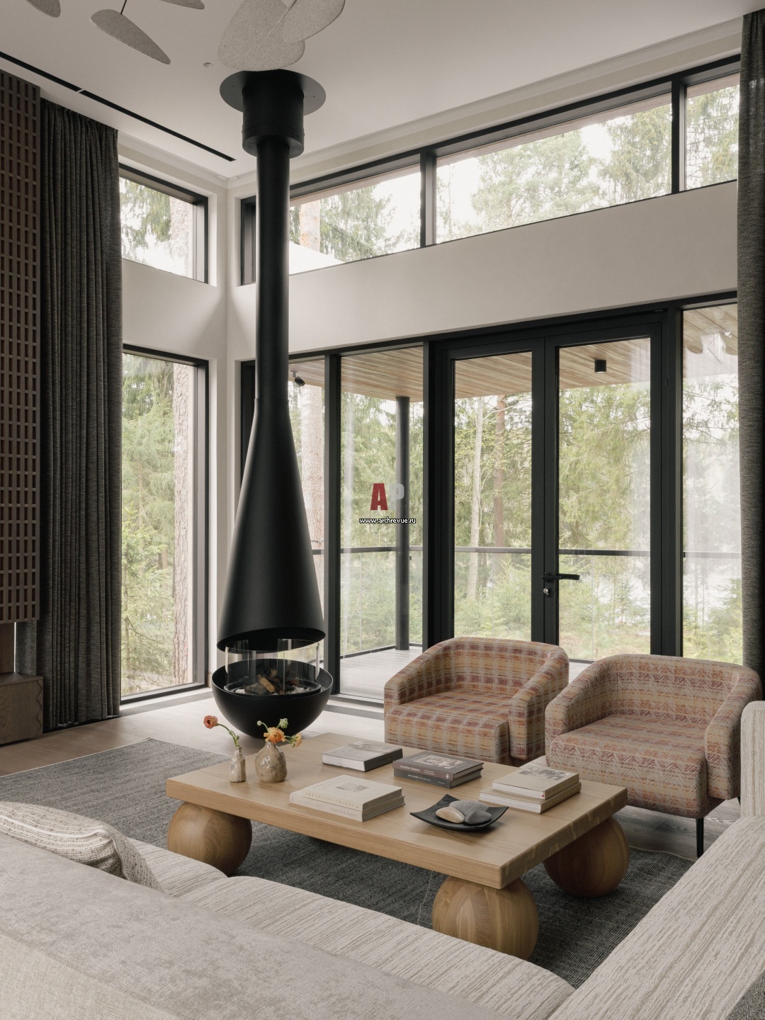Каминная зона в гостиной. Панорамный камин изготовлен из черного металла. Топка обрамлена жаропрочным стеклом.