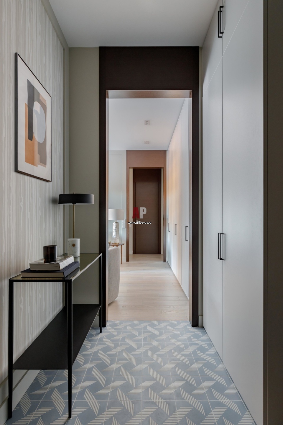Лаконичные дверные полотна дизайнер довела до потолка при помощи панелей и сделала их контрастными, чтобы задать ритм получившимися вертикалями. Это хорошо видно при входе, анфилада проемов уводит взгляд и немного «обманывает» гостя о количестве квадратных метров. Атмосферу расслабления передают обои Cole & Son с рисунком, напоминающим дюны.