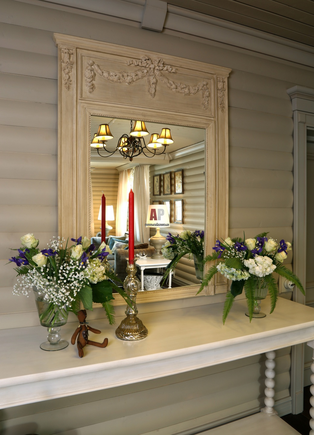 Фото интерьера прихожей небольшого деревянного дома. Зеркало в духе шебби-шик, Mis en Demeure.