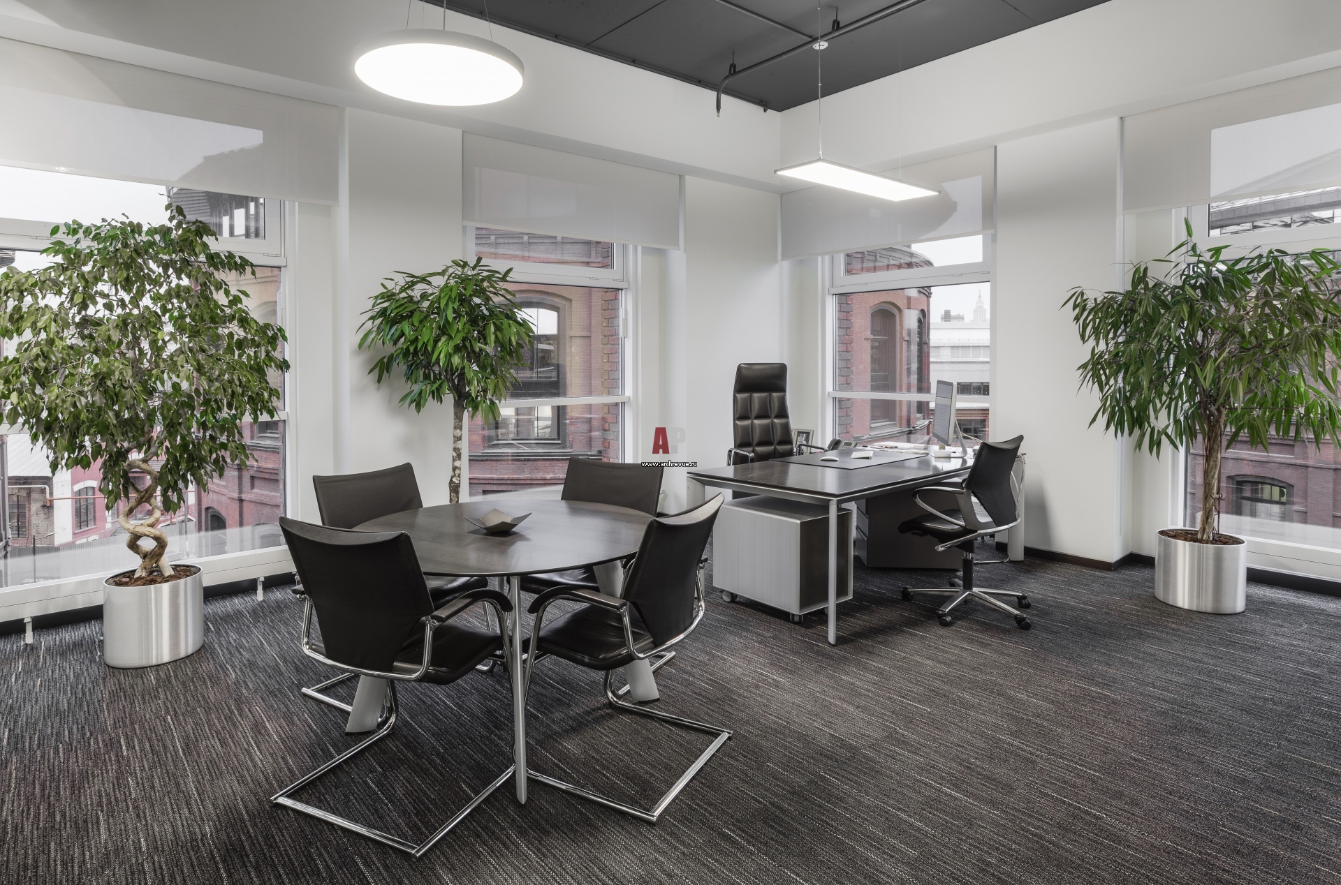 Фото интерьера кабинета. Окна оформлены экранами, которые блокируют свет. Рисунок ковролина задает интерьеру динамику.
