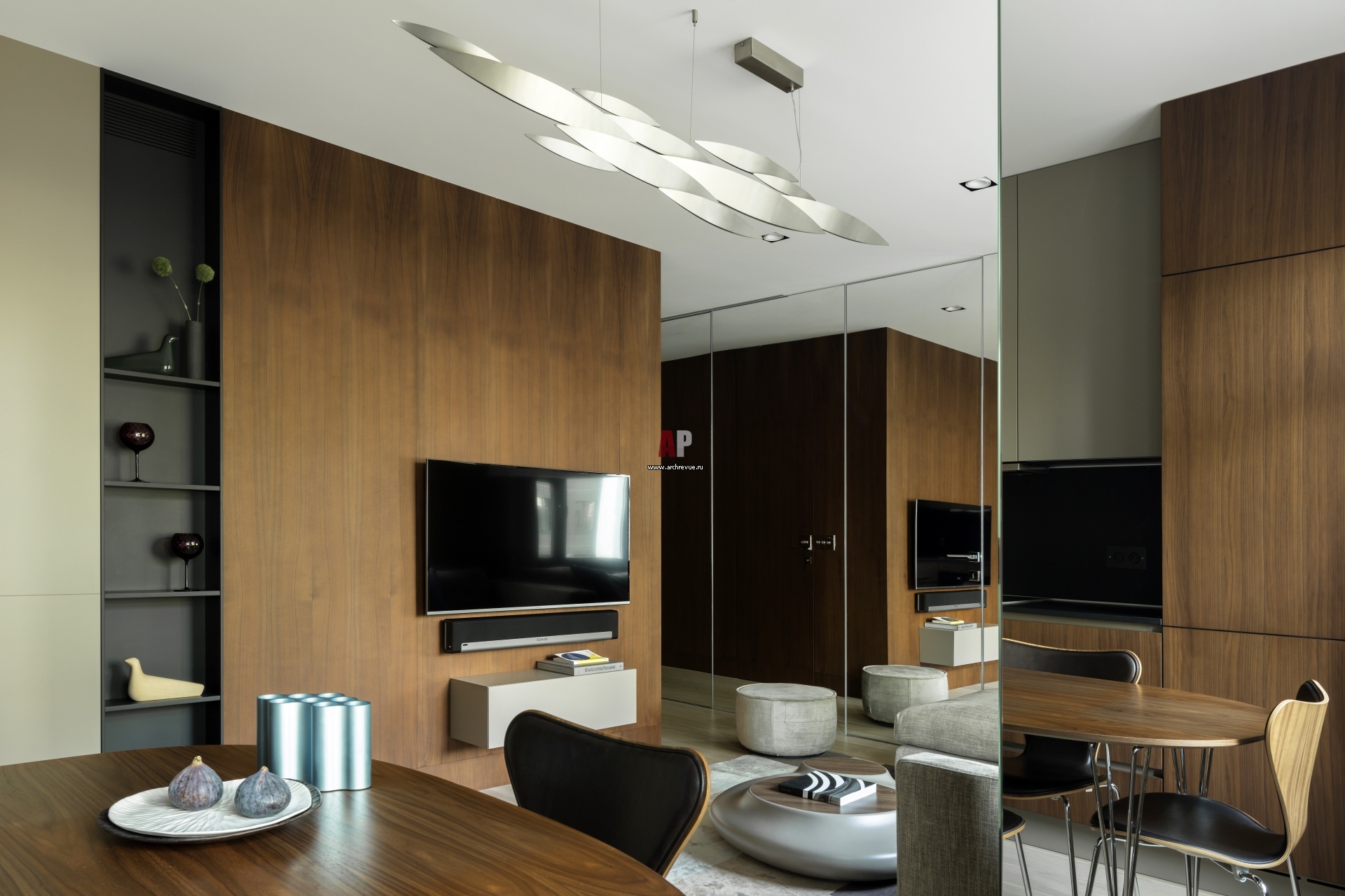 Интерьер квартиры выполнен в комфортной природной палитре с оттенками земли. Стена за ТВ облицована панелями из американского ореха. В минималистичной подвесной полочке под экраном находится аудио- и видеооборудование.