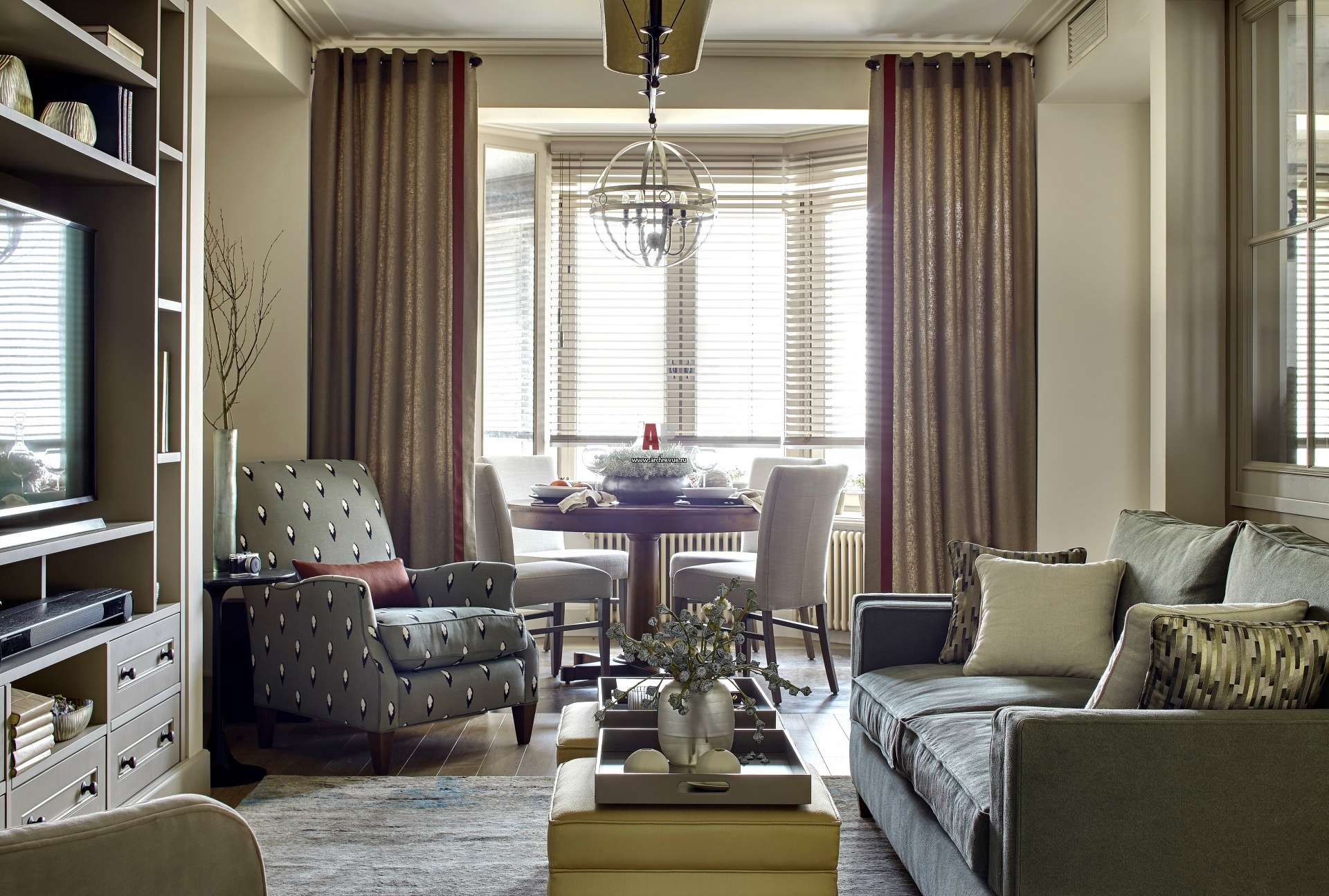 Семейная квартира «Времена года». Фото интерьера гостиной. Диван в обивке Antoine D’Albiousse и кресло в обивке Jim Thompson изготовлены на заказ. Столики, Crate and Barrel. Центральный светильник, Arteriors.