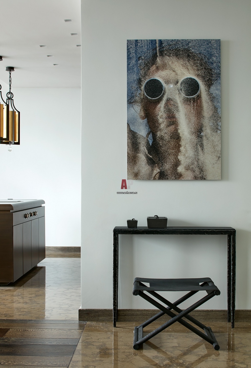 Из прихожей открывается вид на общую гостиную-кухню. Консоль Christian Liaigre, модель Parchemin. Над ней – фоторабота Александра Егорова из серии «Песочный человек». Бронзовые шкатулки, Promemoria.