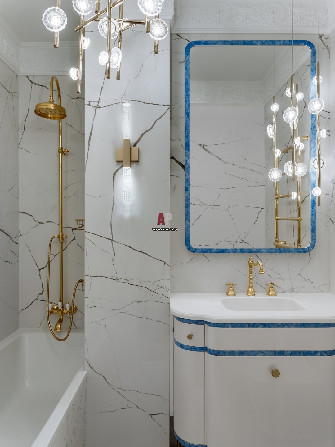 Ванная комната при спальне дочери. Мебель и зеркало по эскизам дизайнеров. Бра, Contardi. Люстры, IDL.