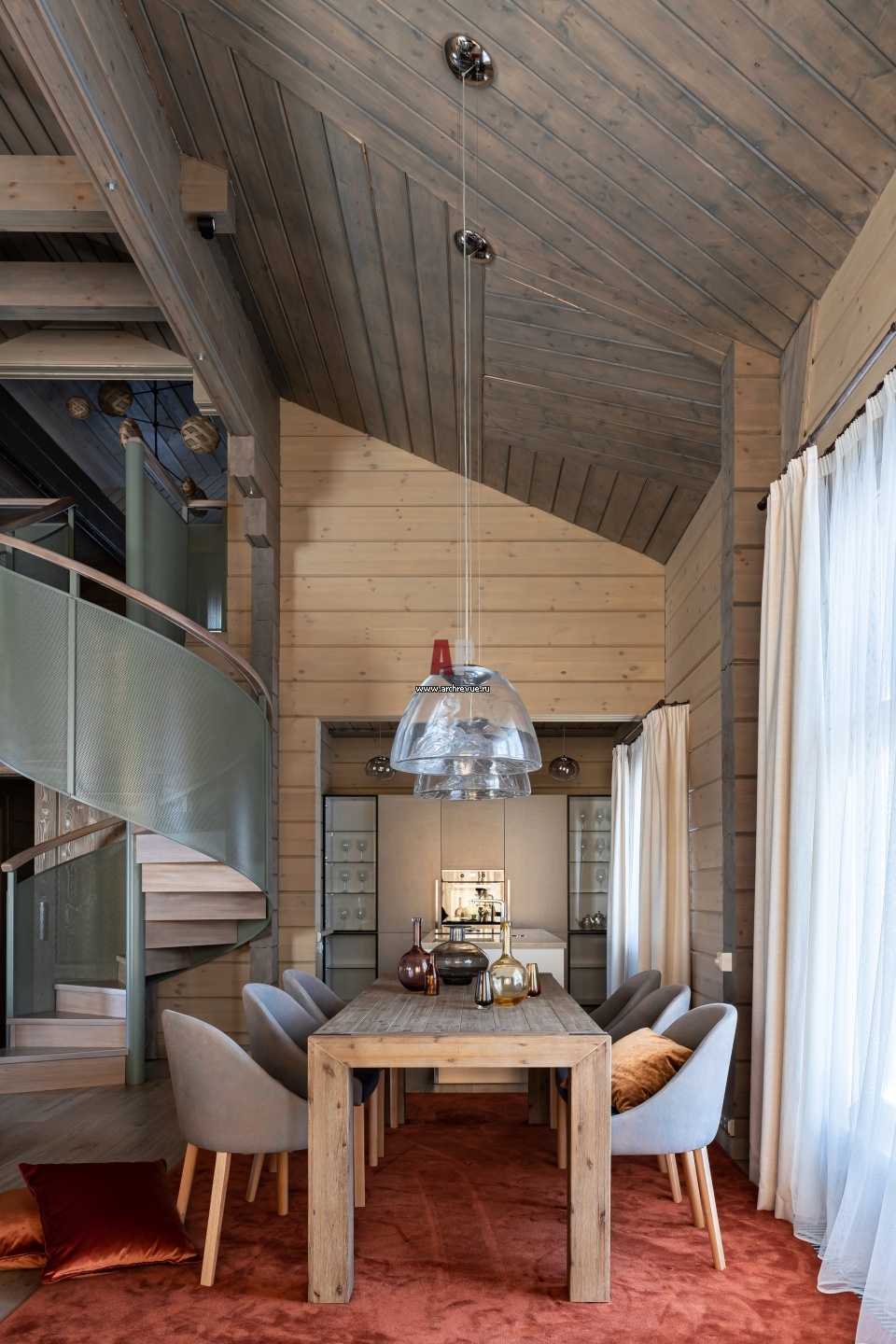 Зона столовой в общей гостиной. Кресла, Paged, модель Lubi. Светильники над обеденным столом, Axo Light, модель Mountain view. Стены и потолок покрыты защитным составом, Tikkurila, Supi Saunasuoja.