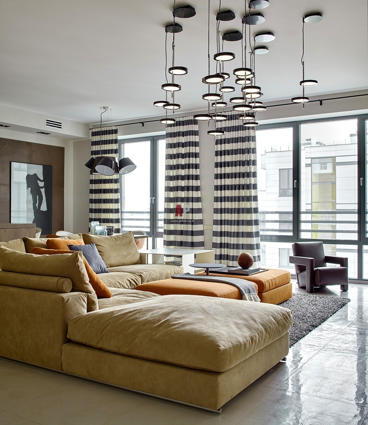 Интерьер гостиной. Потолочный светильник, Marset. На полу – крупноформатный керамогранит, Atlas Concorde.