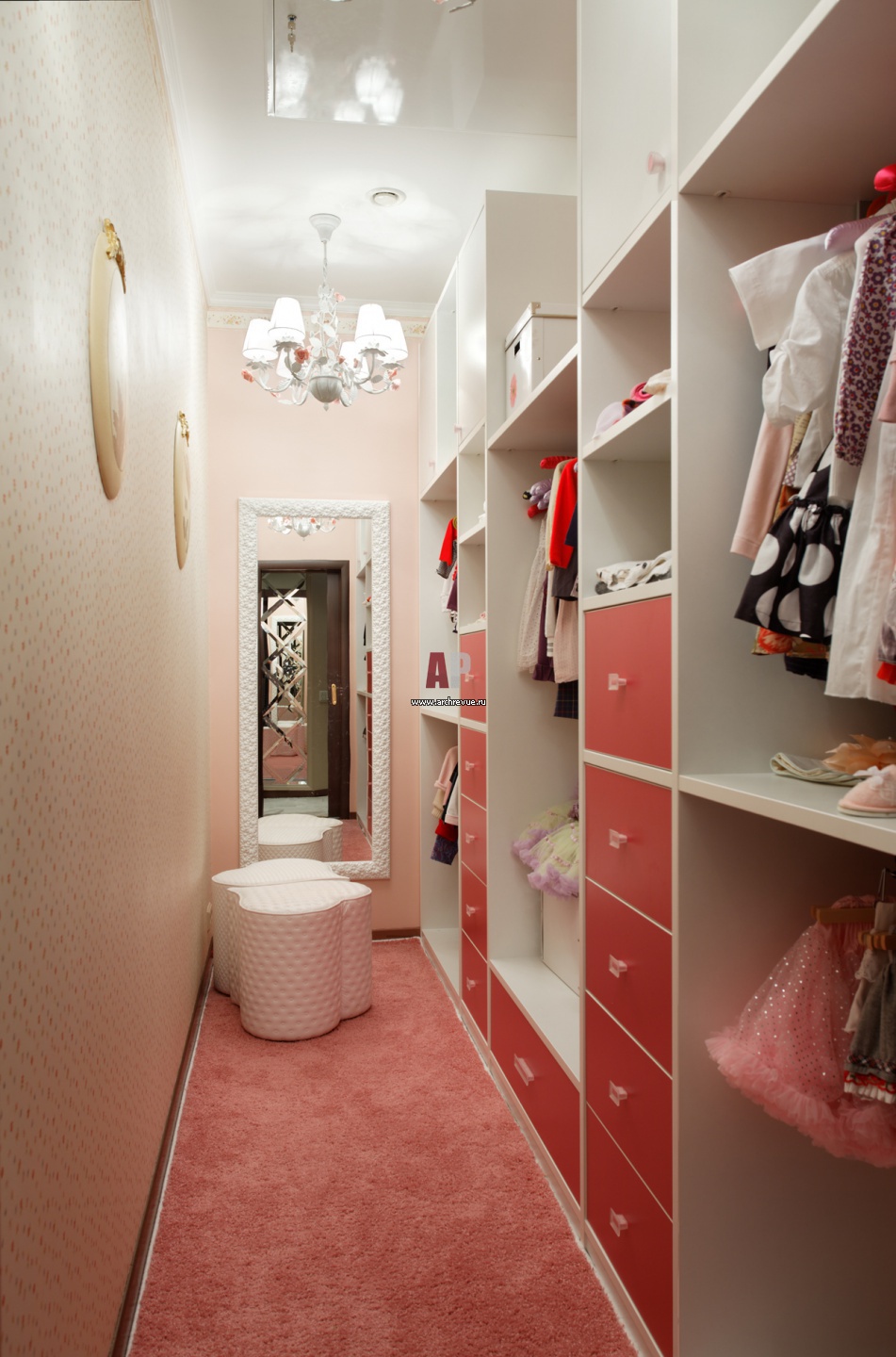 Фото интерьера детской гардеробной. Она выполнена с элементами гламура.