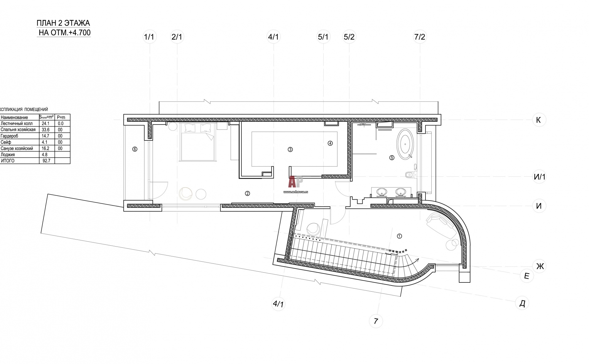 План второго этажа двухэтажного дома со сложной геометрией и наклонными потолками. Общая площадь: 520 кв. м.